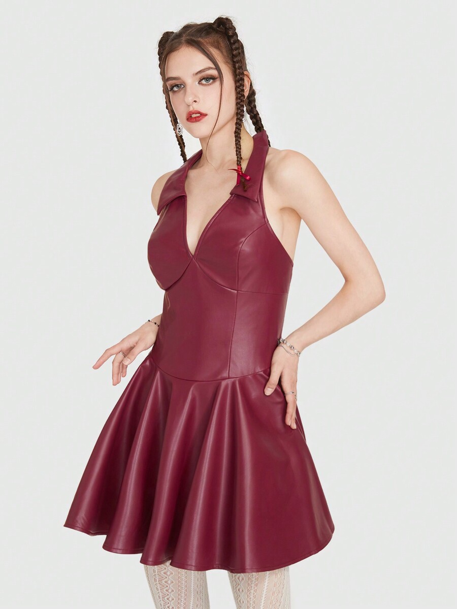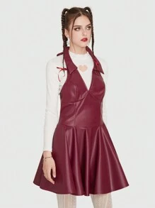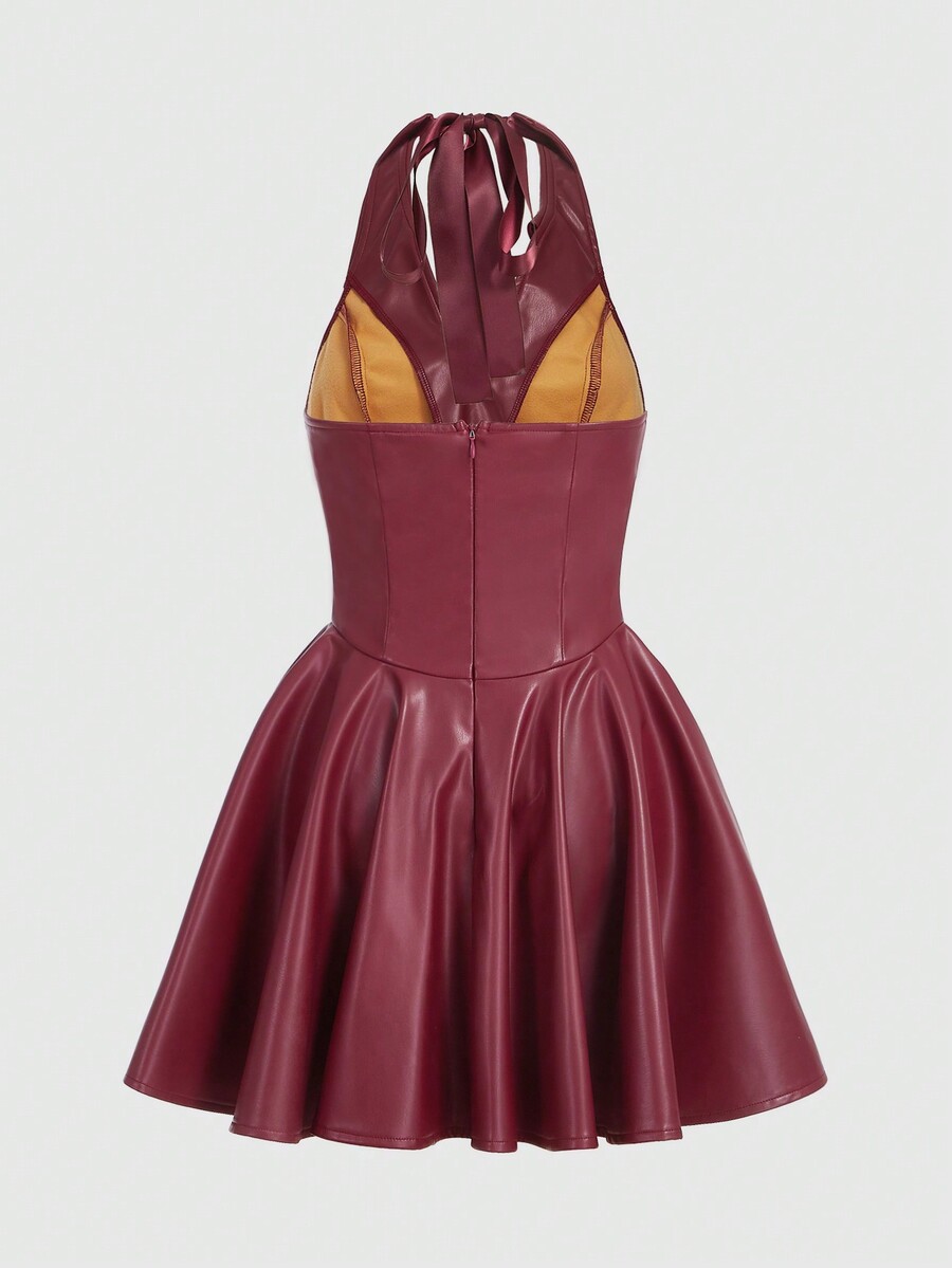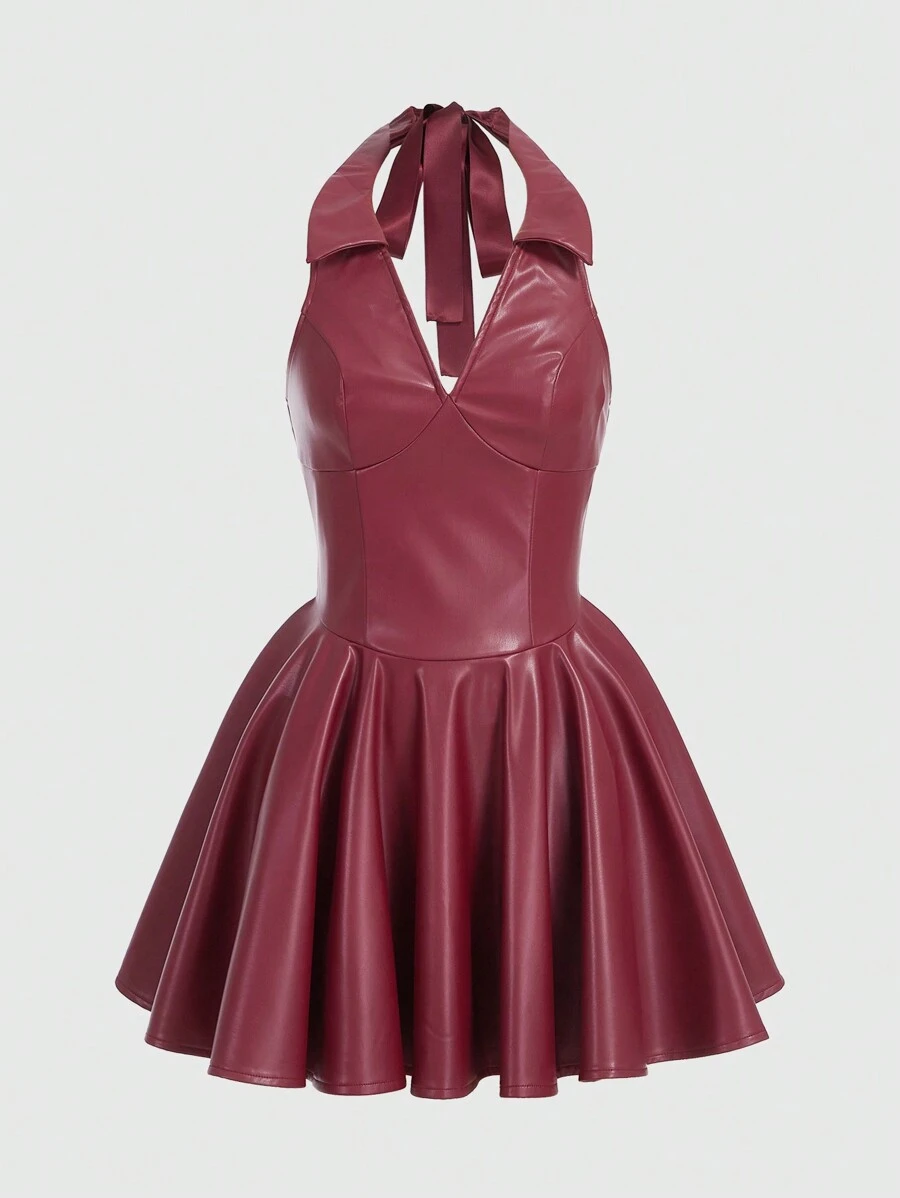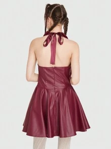 Kleid mit Einfarbig PU Neckholder, rückenfrei ausgestelltem Saum,