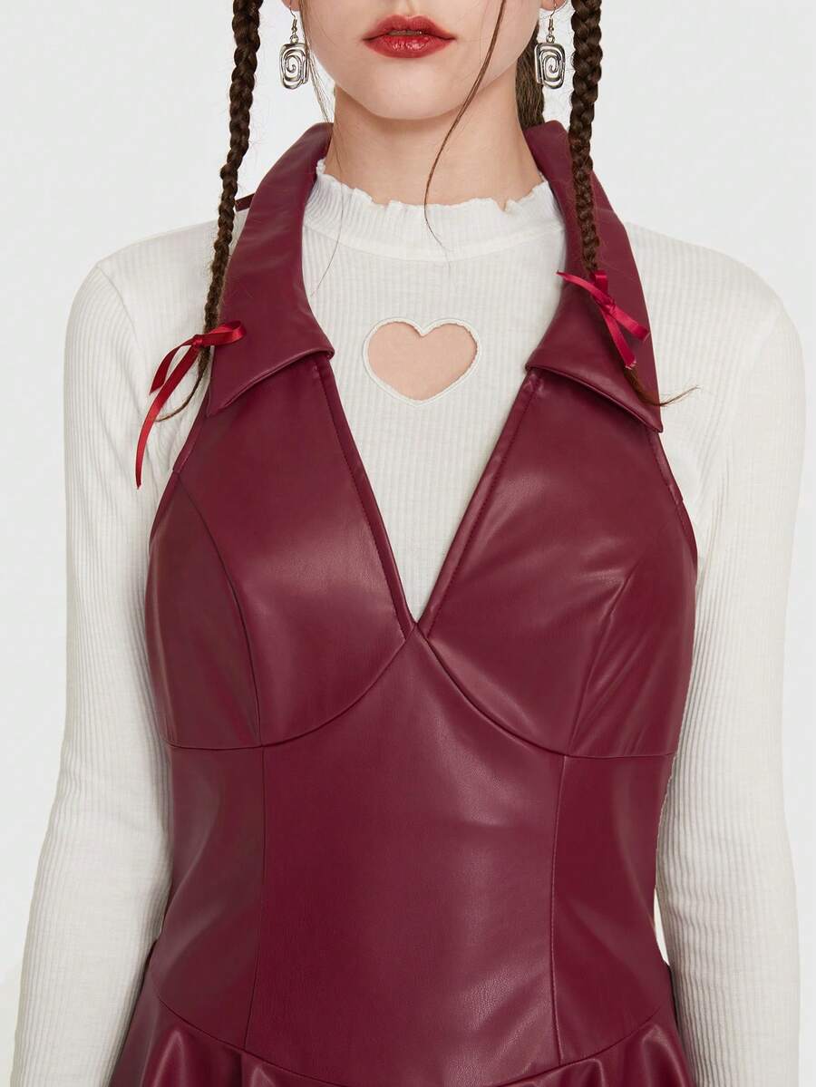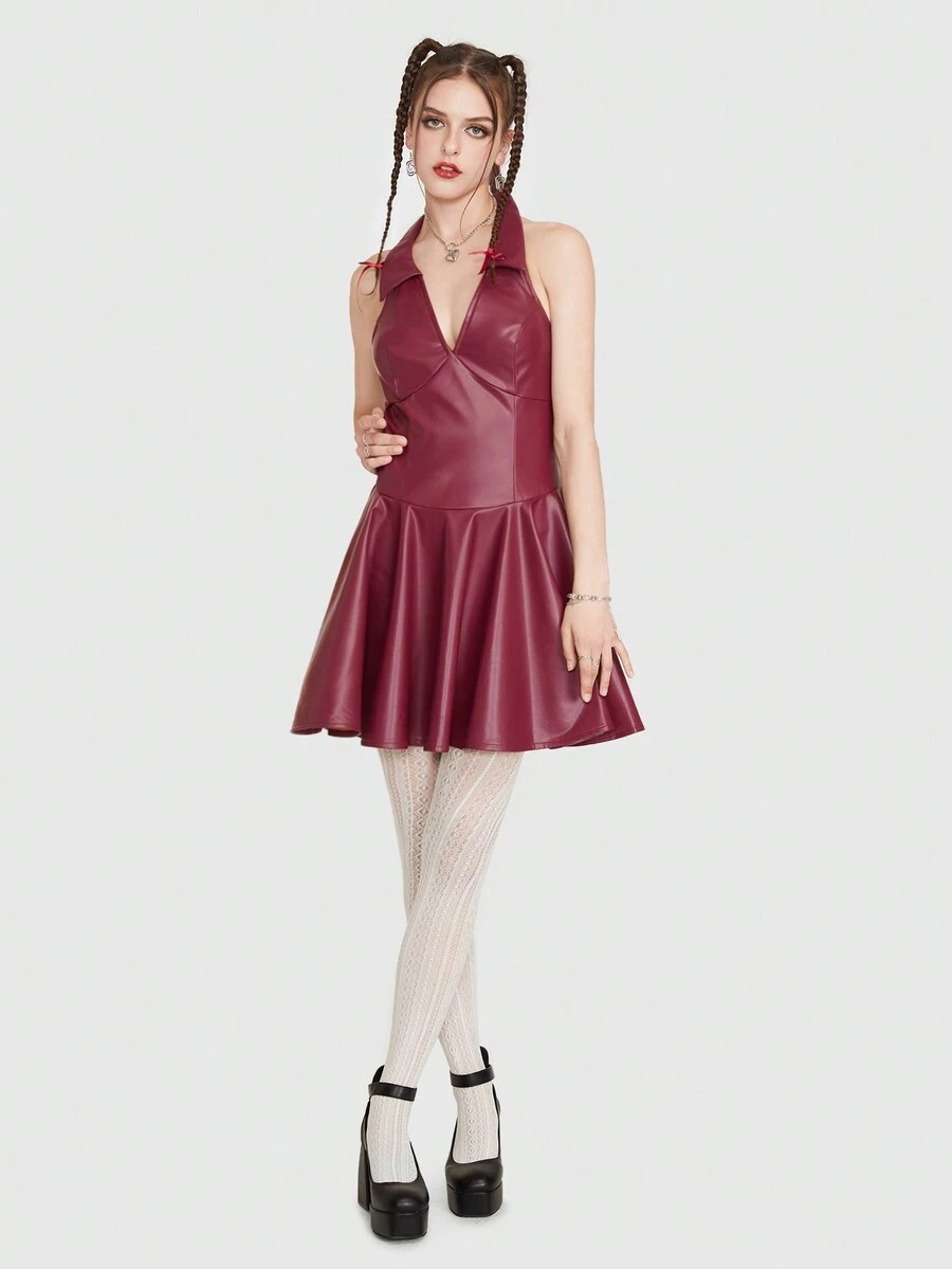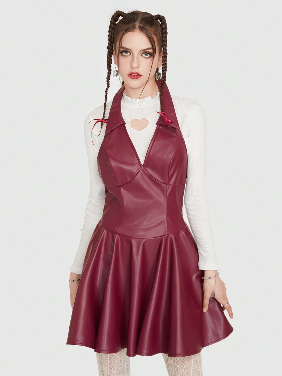 Kleid mit Einfarbig PU Neckholder, rückenfrei ausgestelltem Saum,