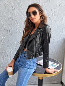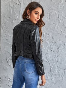 Einfarbige PU Leder Biker Jacke mit Krokodil Prägung und Reißverschluss