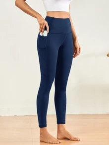 Einfarbige Sports Leggings mit weitem Taillenband und Handytasche