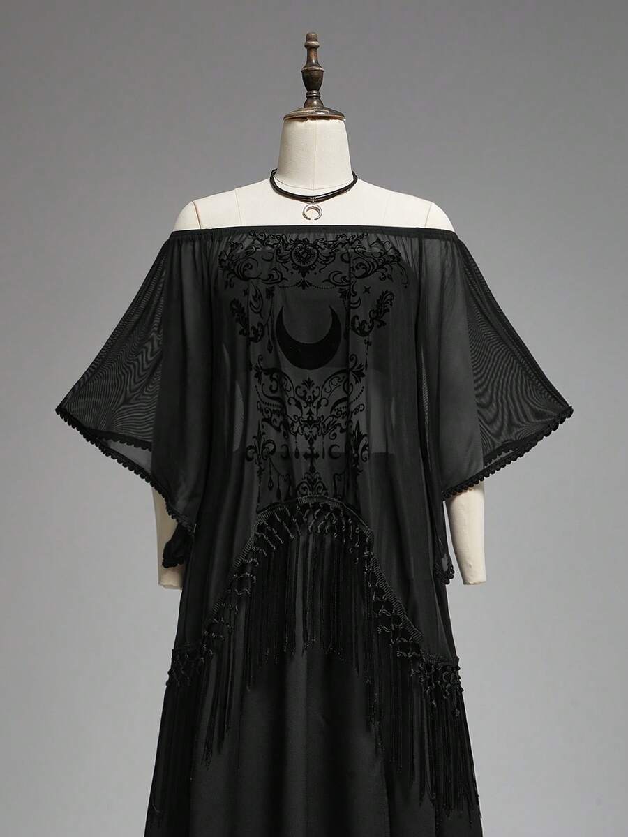 Asymmetrischer Saum Fransenbordüre Off-Shoulder Transparente Bluse, Dunkel Verbotener Wald Boho Goth Stil