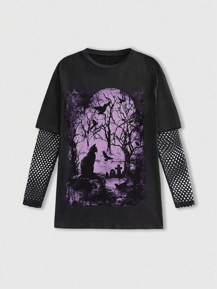 Gothic Dark Academy Katzen-Muster Mesh Patchwork Loose T-Shirt für Frauen