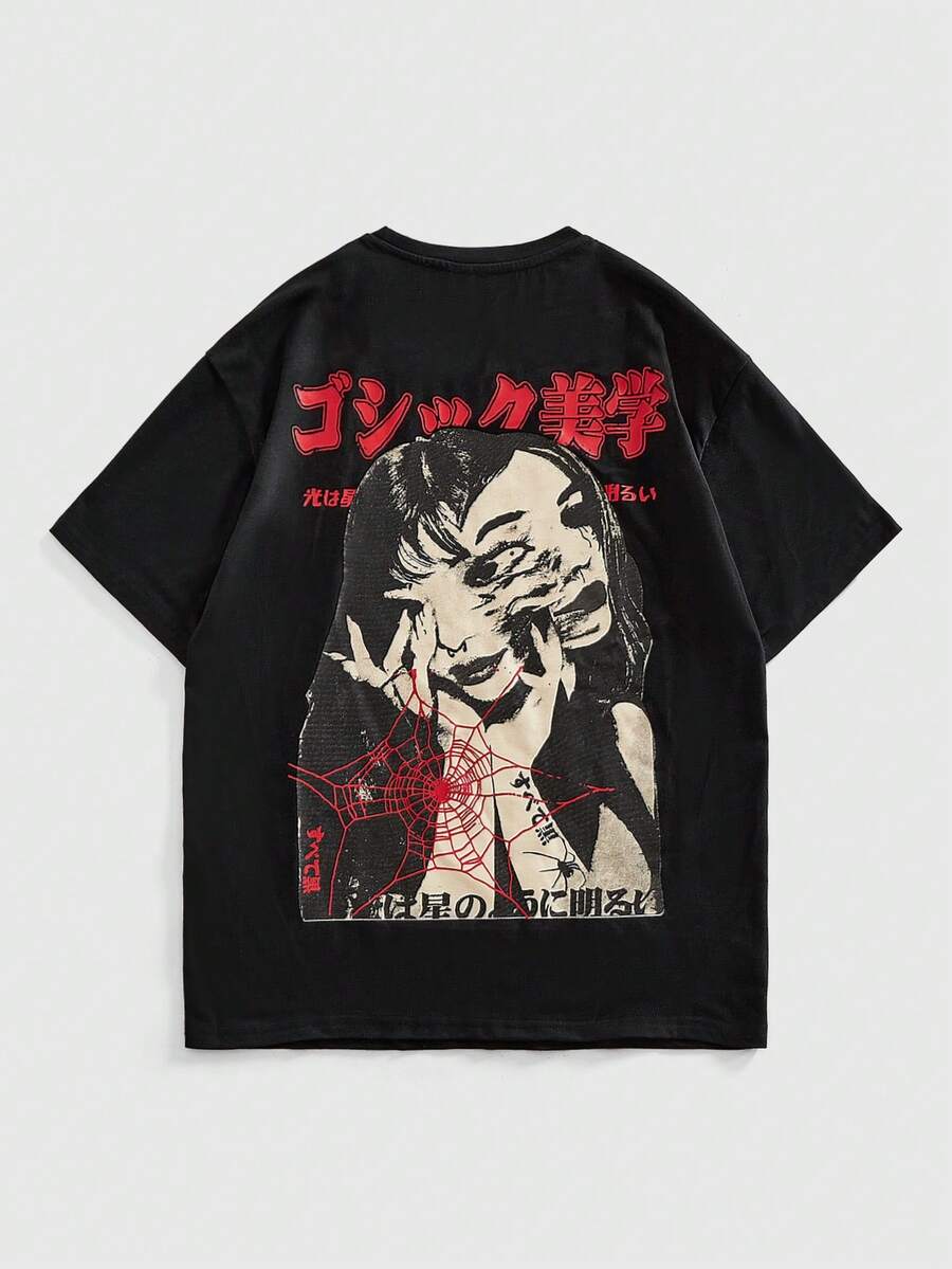 Street Life Anime Portrait Muster Rundhals Lässig T-Shirt, Preppy-Style, 2000er Jahre Ästhetik