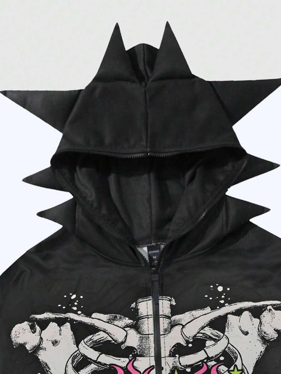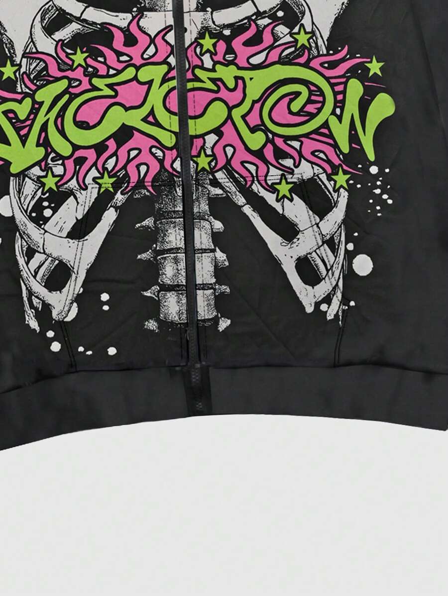 Herren Lässig Sweatshirt mit Kapuze, Reißverschluss und Cartoon Skelett Muster, Herbst