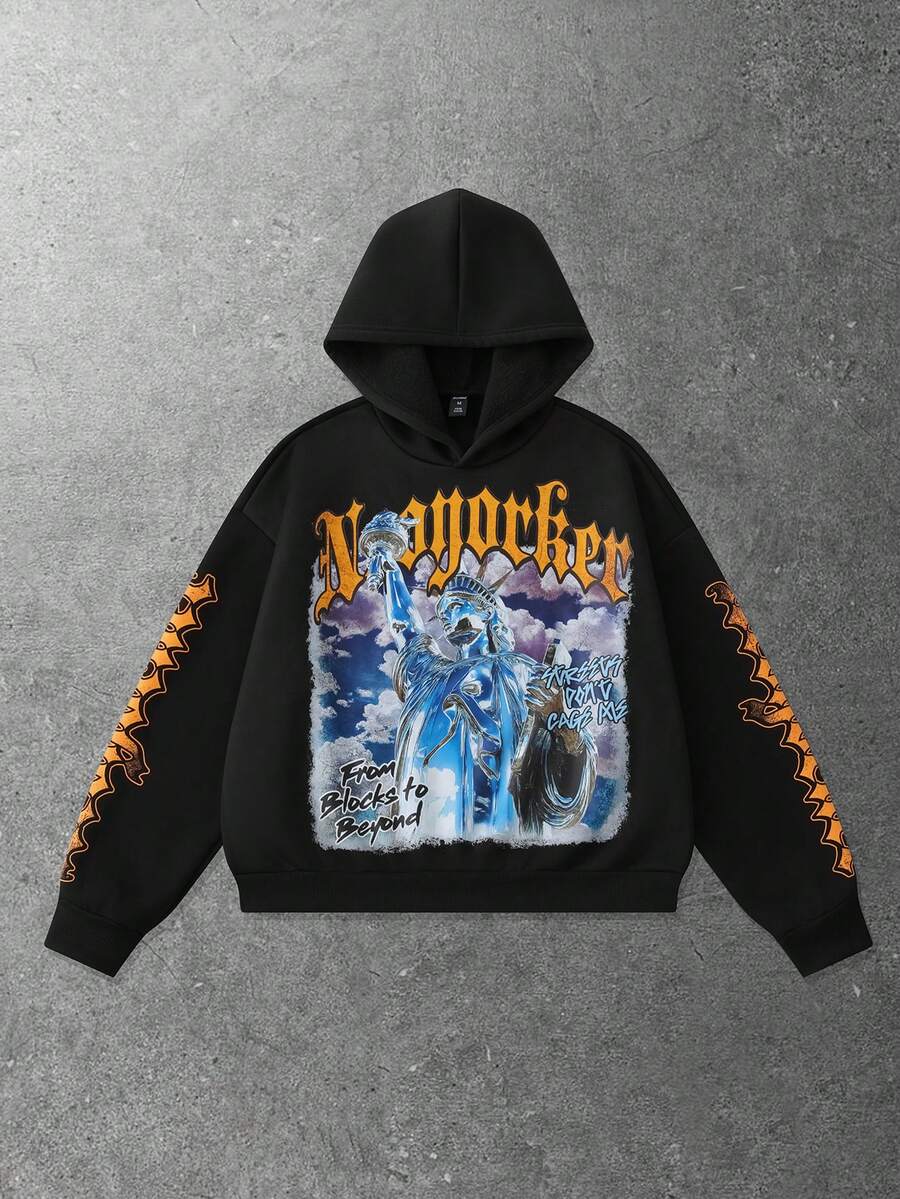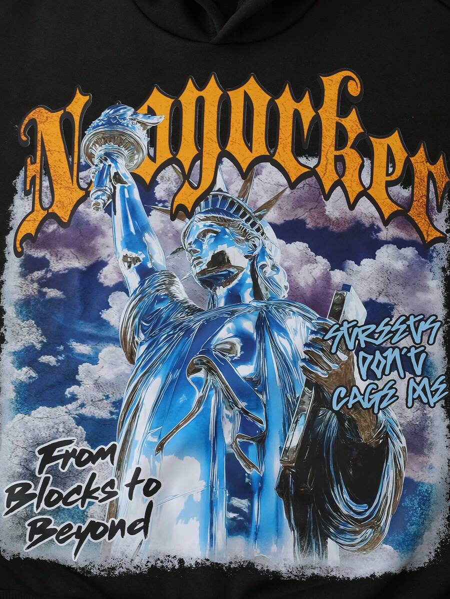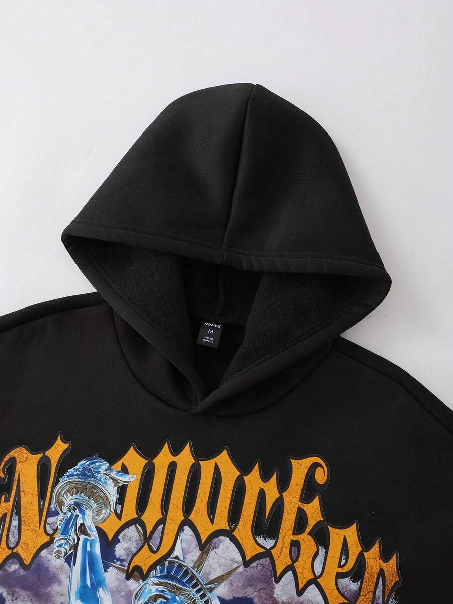 Street Life Herren lässige, locker geschnittene Hoodie mit Schulterausschnitt, mit Freiheitsstatue- und Buchstabe Muster, für Herbst/Winter