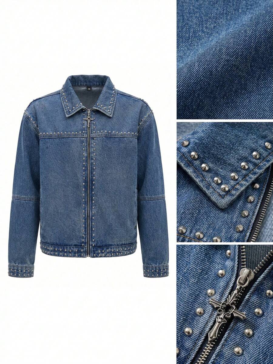 Street Life Herren Lässige Nieten Reißverschluss Vordere Dropped Shoulder Denim Jacke