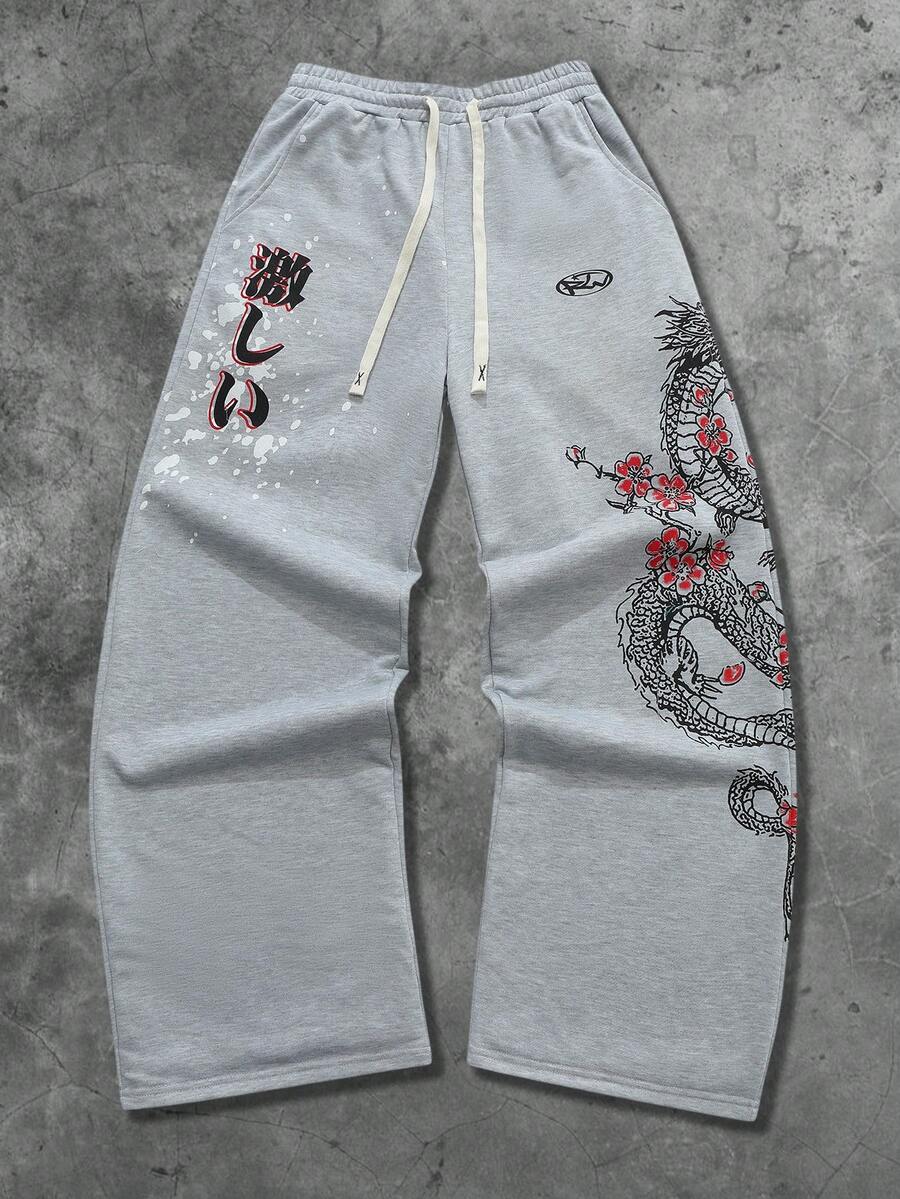 Street Life Herren Jogginghose mit chinesischem Drachen Muster, Tunnelzug Taille, Taschen und weiter Passform