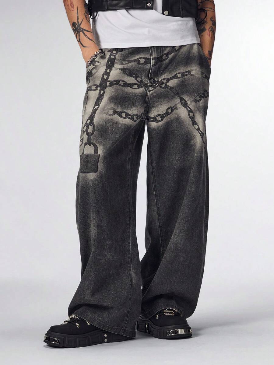 Street Life Herren Jeans mit hoher Taille, Gürtelschlaufen, gerade, locker geschnitten, digitaldruck, gebogene Schnittführung
