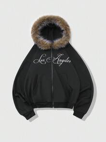 Street Life Herren Kapuzenpullover mit gesticktem englischen Text und Fellkragen, Streetstyle, Herbst Winter