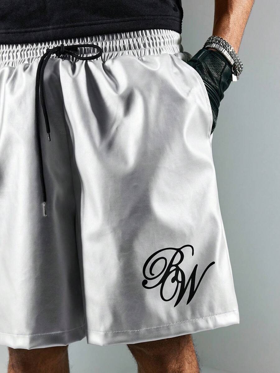 Street Life Herren Shorts mit Buchstaben-Muster, Kordelzug in der Taille, glänzendes silberfarbenes PU