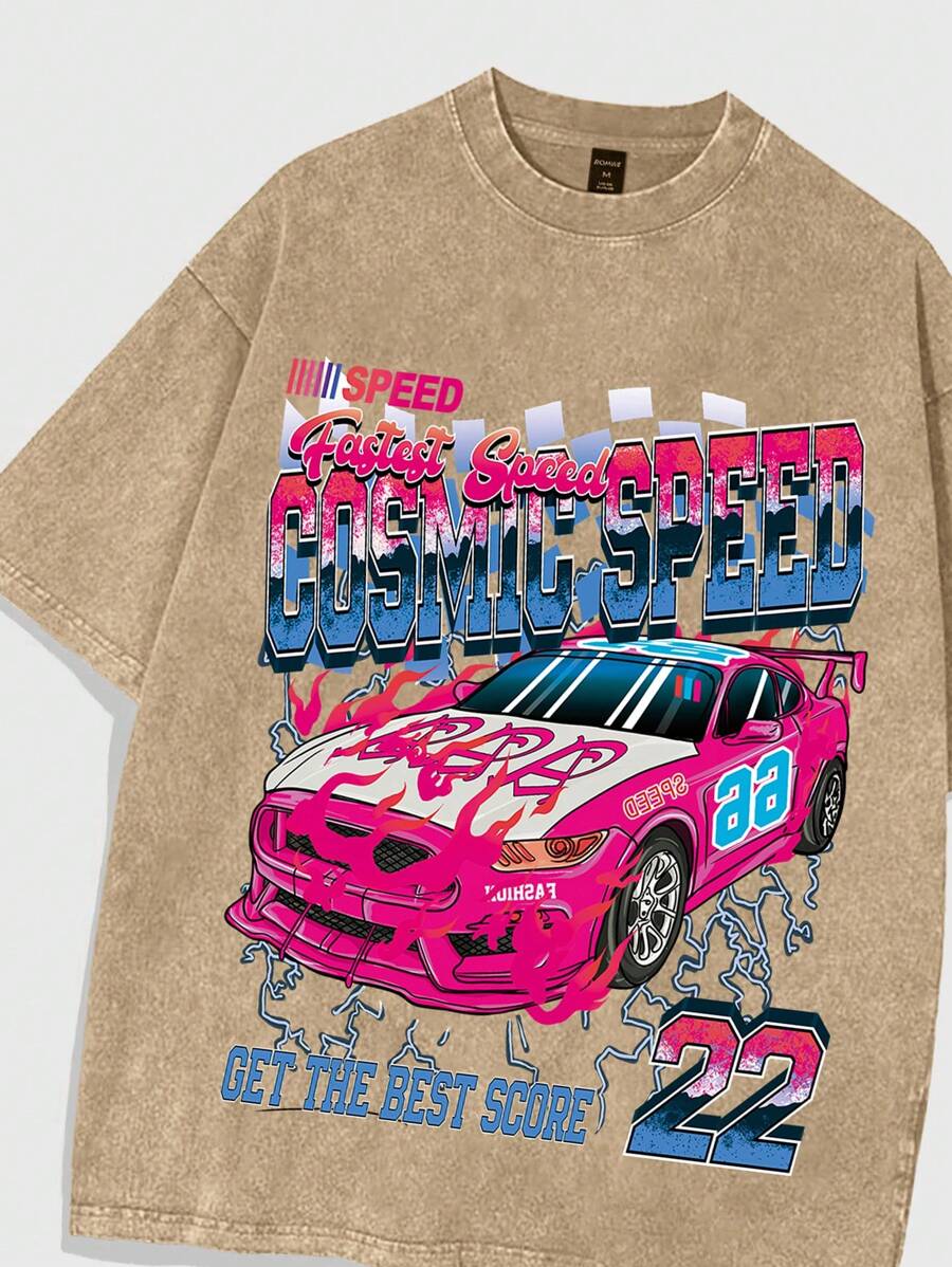 Street Life Herren Racing Street Muster gewaschenes Kurzarm T-Shirt Set, High Street Vintage