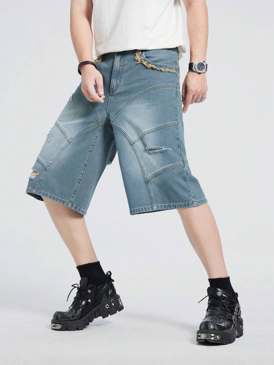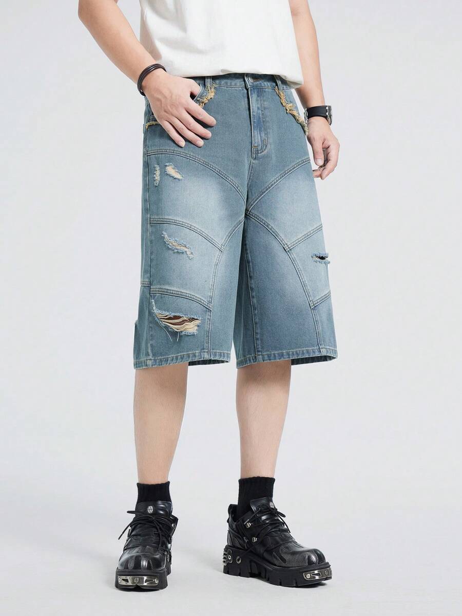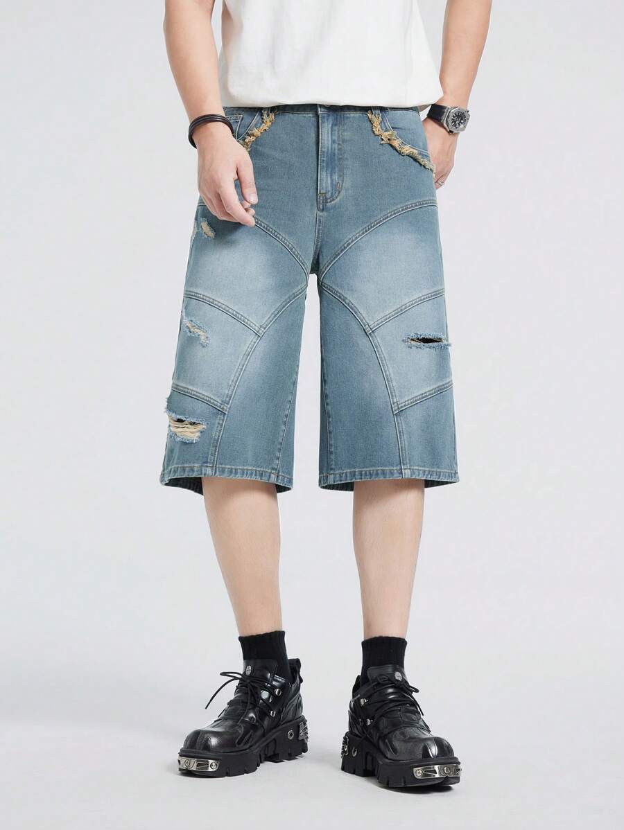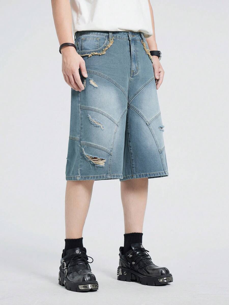Street Life Herren Sommer Lässige Verwischte Zerrissene Knie-Länge Denim Shorts (Jorts)