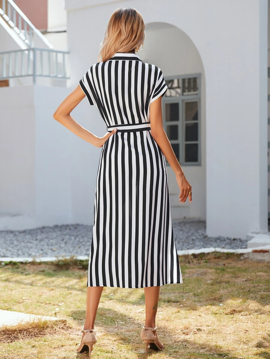 Hemdkleid mit Streifen, Knöpfen vorne, Gürtel und Schlitz