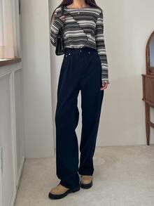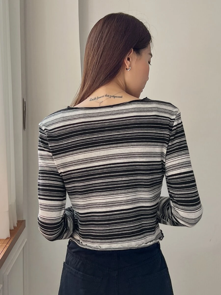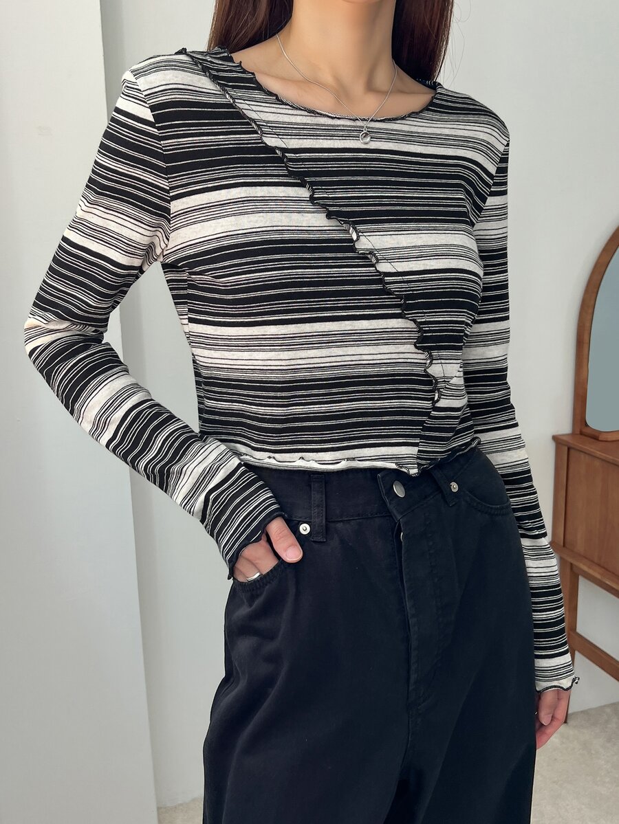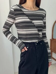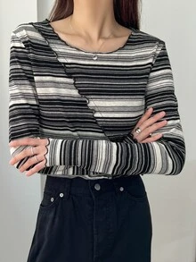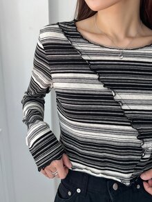Crop T-Shirt mit Streifen Muster, Wellensaum