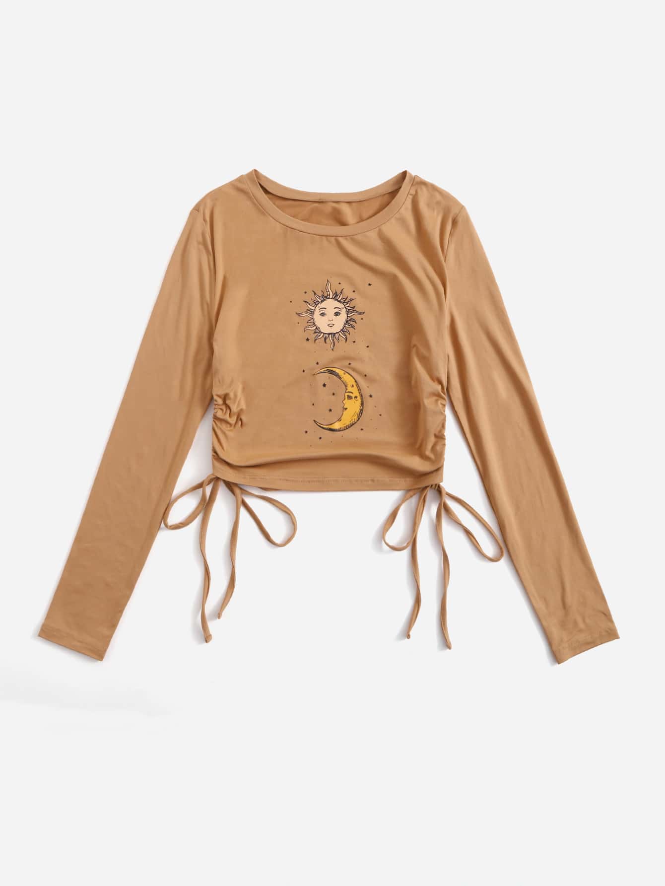 Crop T-Shirt mit Sonne & Mond Grafik, Tunnelzug, Rüschen