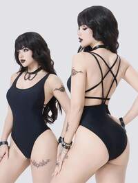 Goth Gotischer Badeanzug mit Kreuz-Riemen, verstellbarer Kordelzug, Einteiler, Halloween