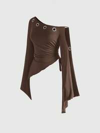 ROMWE Avant Vintage asymmetrisches Schulter-Taillenzug-Trompetenärmel Ösen Lässig Fledermausärmel Damen T-Shirt