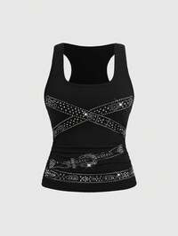 Grunge Punk Große Größen tailliertes Tank Top mit Musikfestival Western Punk Muster und Strass Dekor