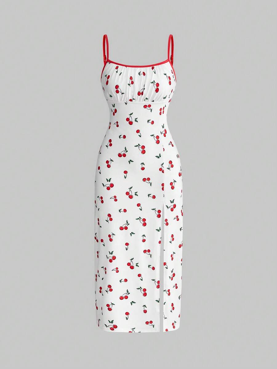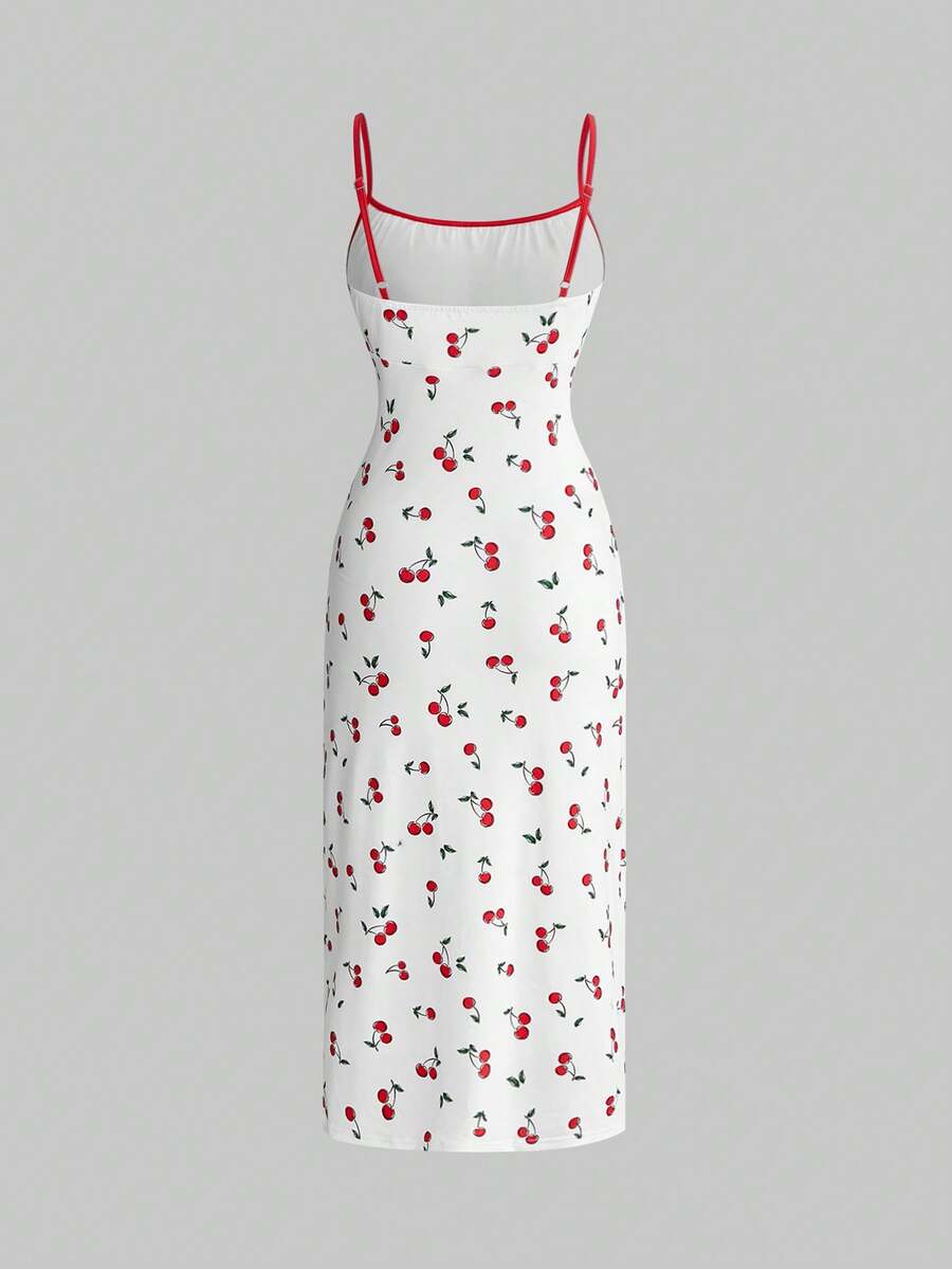 Sweetness Frühlings-/Sommer-Kleid für Frauen mit süßem Kirschprint und Schlitzträgern, geeignet für Musikfestivals, Partys, Konzerte, Hochzeiten, Galas, Urlaube, Picknicks, Dates und andere Anlässe
