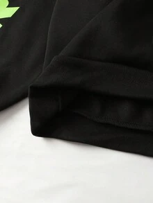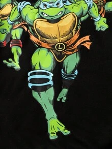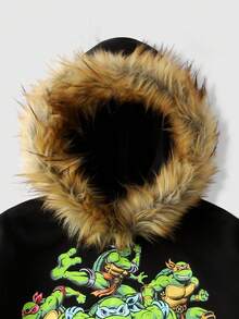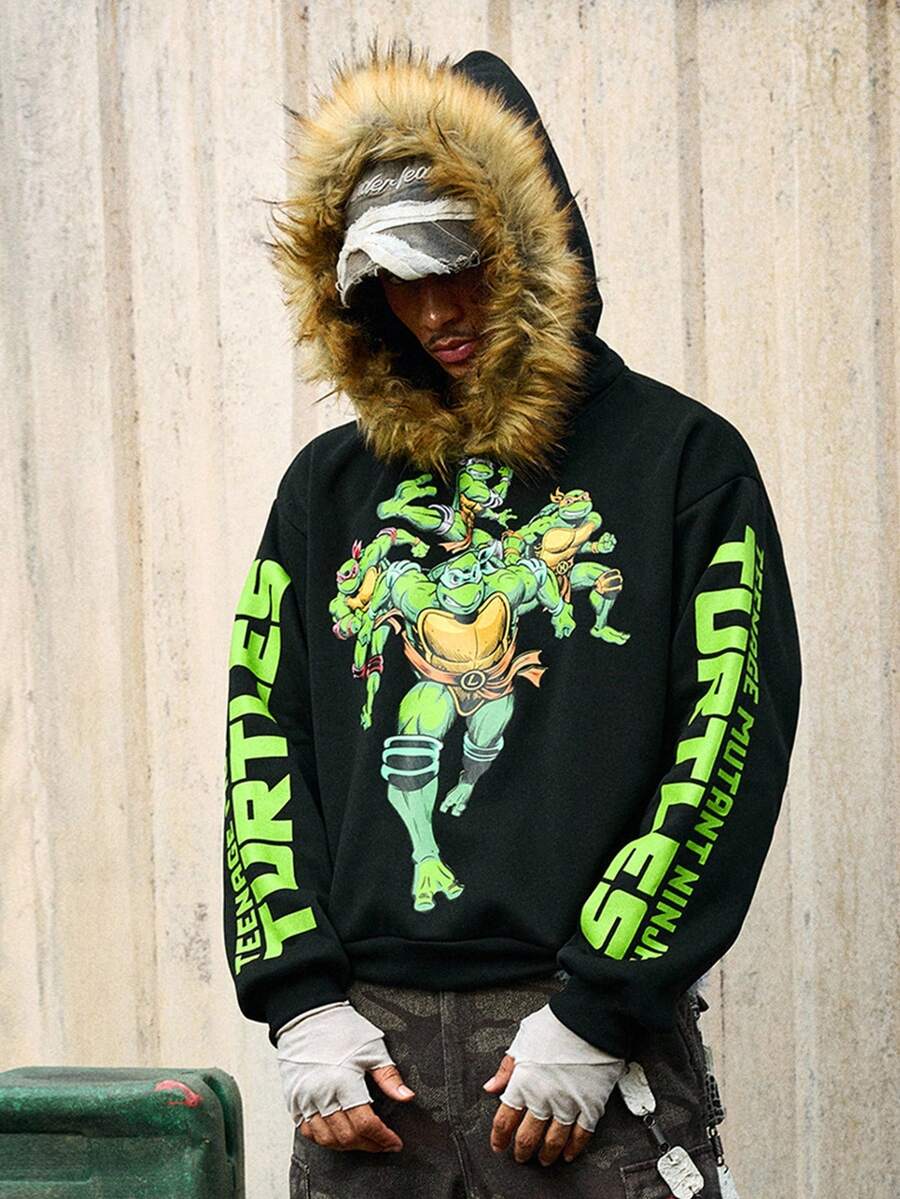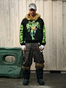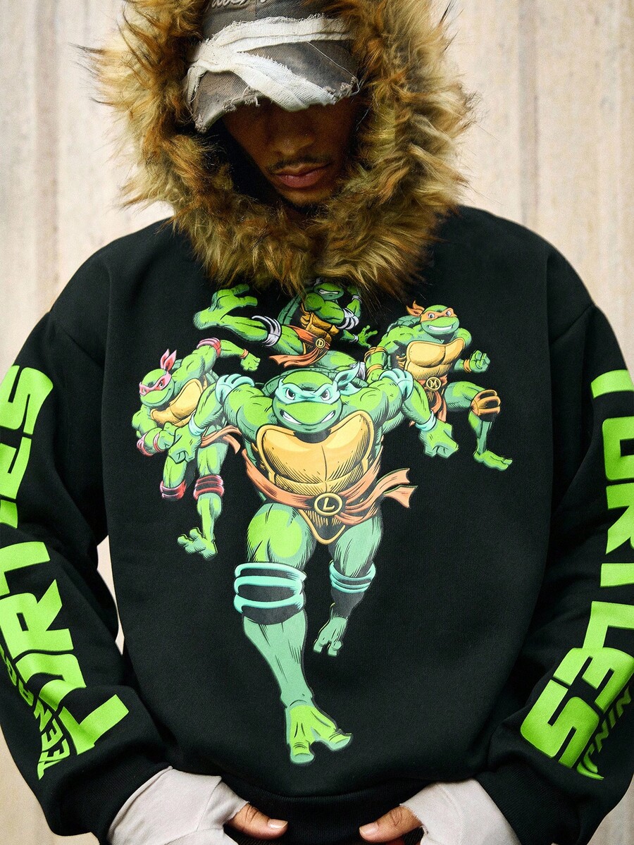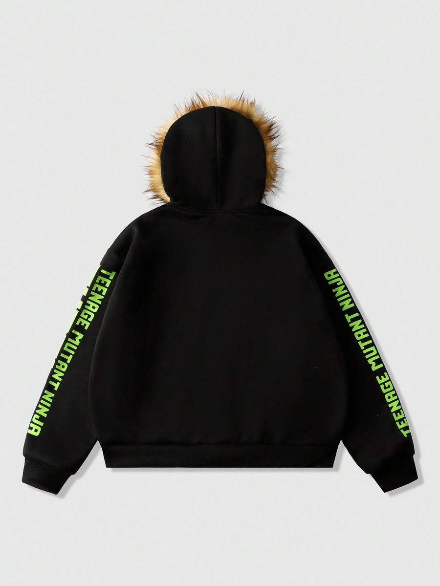 TEENAGE MUTANT NINJA TURTLES X ROMWE Herren Lässig Kapuzenpullover mit Buchstaben- und Schildkrötendruck sowie Fellbesatz, Herbst/Winter