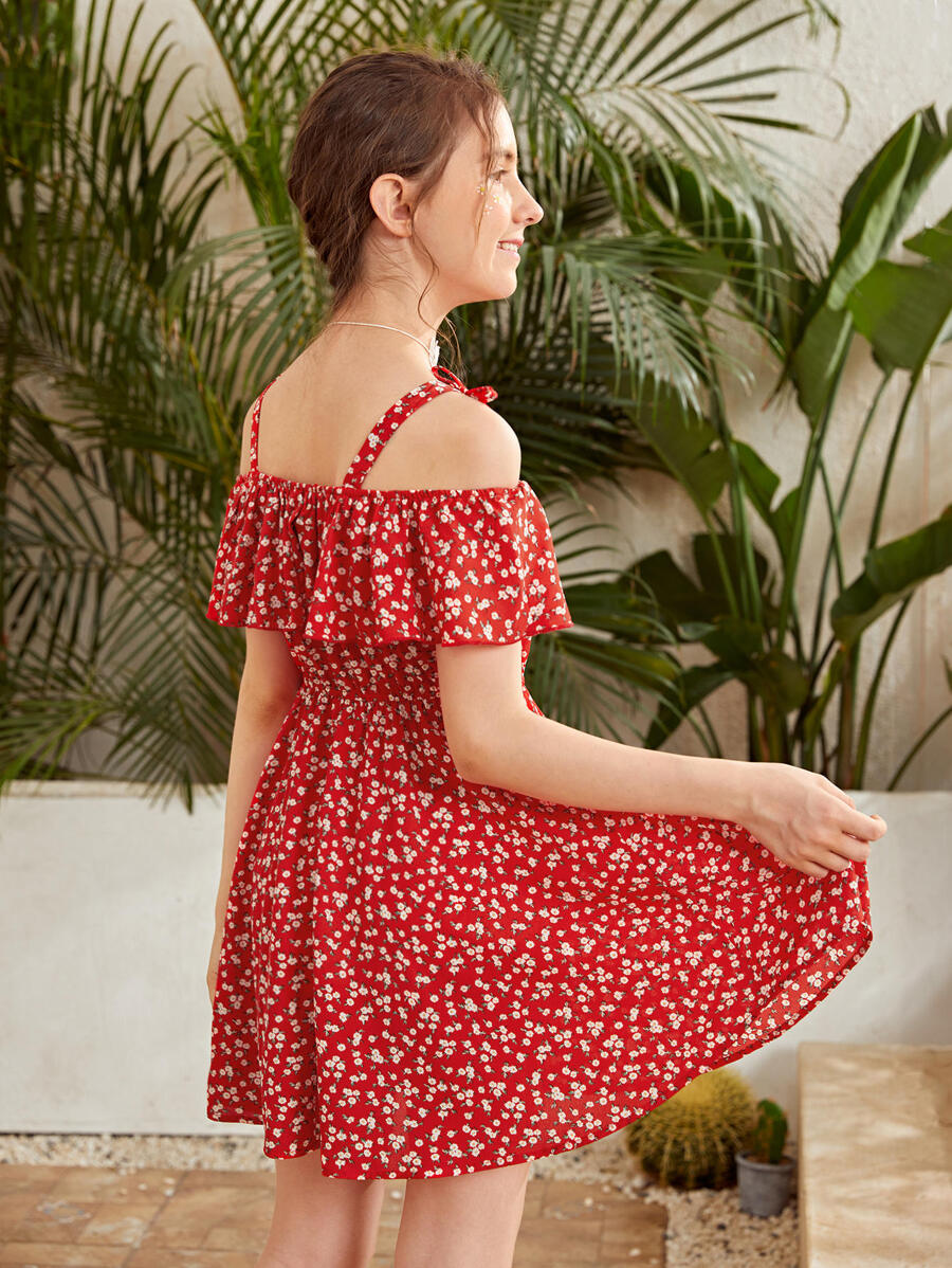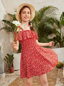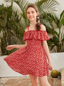 Teen Mädchen schulterfreies Kleid mit Rüschen und Blümchen Muster