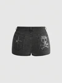 J-Fashion Damen Große Größen Retro Y2K Sexy Taillenshorts mit niedriger Taille, Buchstaben-Stickerei, Herz-Kreuz-Strass und Destroyed-Effekt
