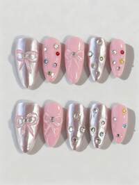 Kawaii 10 Stücke süße Schleifen-Diamant-Element handgemachte Fake Nägel + 3 Stücke doppelseitiges Klebeband, Y2K Silber-Rosa handbemalte Fake Nägel, hochwertige Glitzer-Kristall-Farbe abnehmbare mittelgroße Mandel-förmige Tragearmatur, geeignet für Feierlichkeiten, Tänze und den täglichen Gebrauch.