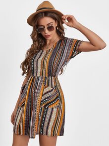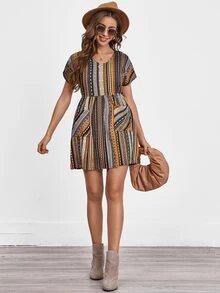 Kleid mit Stamm Muster und Tasche vorn