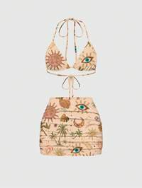 ROMWE Avant Damen Numerik-Muster Drapierter Ausschnitt Trägertop und Mini-Rock Lässig 2-Teiler Set
