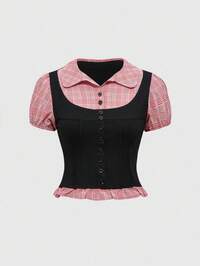 Academia Kollegialer Stil 2 in 1 Schwarz & Grau kariertes Patchwork Kurzarm Damen Hemd