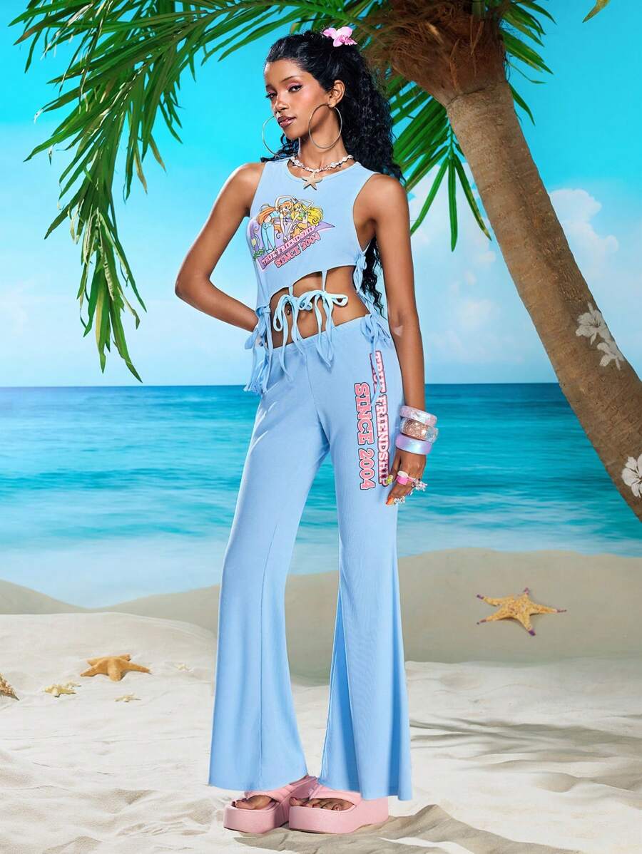 Winx Club X ROMWE Damen 2-teiliges Set mit Cartoon-Grafik, Rundhals-Knoten Crop Top und Hose