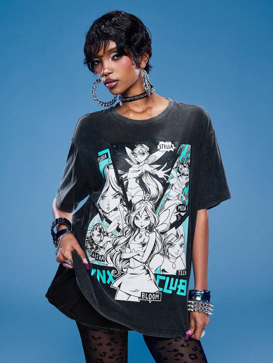 Winx Club X ROMWE Damen Lässig Porträt & Buchstaben Grafik Oversized Kurzarm T-Shirt, Sommer