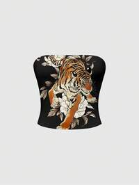 ROMWE Avant Tiger Grafik Sexy Neuer Chinesischer Stil Schwarz Baumwolle Trägerhemd Top für Frauen