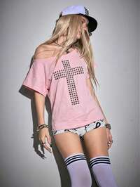Grunge Punk Lässiges Damen T-Shirt mit niedrigem Schnitt, enganliegender Passform, elastischem Strass Kreuz- und Flügel Muster am Kragen