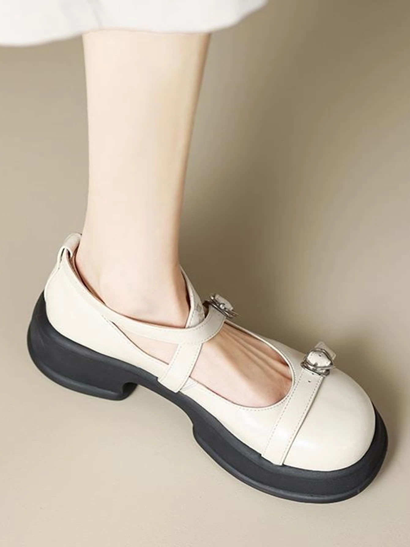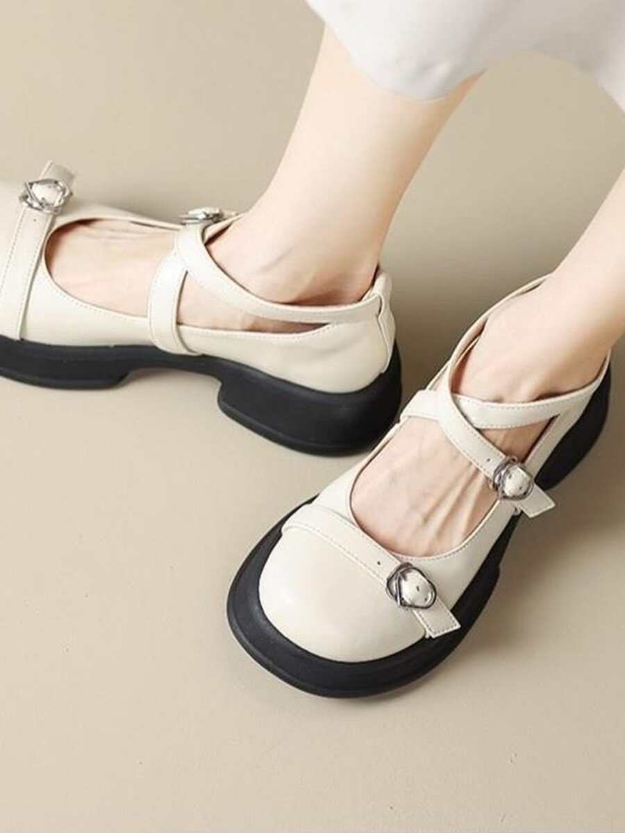 Damen-Mary-Jane-Schuhe mit Schnallendekor und Criss-Cross-Plattform, Preppy-Beige-Plateauschuhe