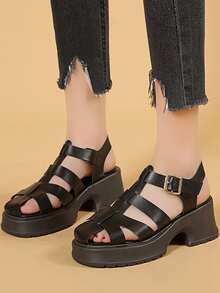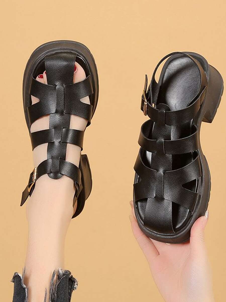Damen Cut Out Knöchelriemensandalen, schwarze Punk Sandalen mit Keilabsatz