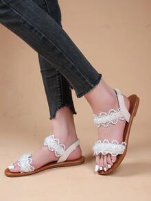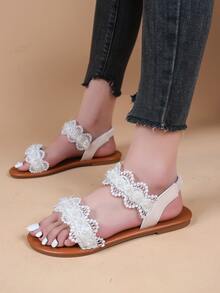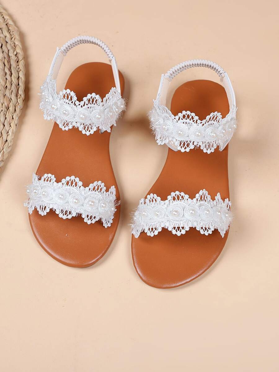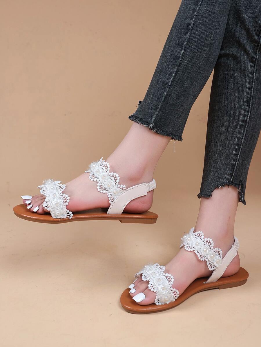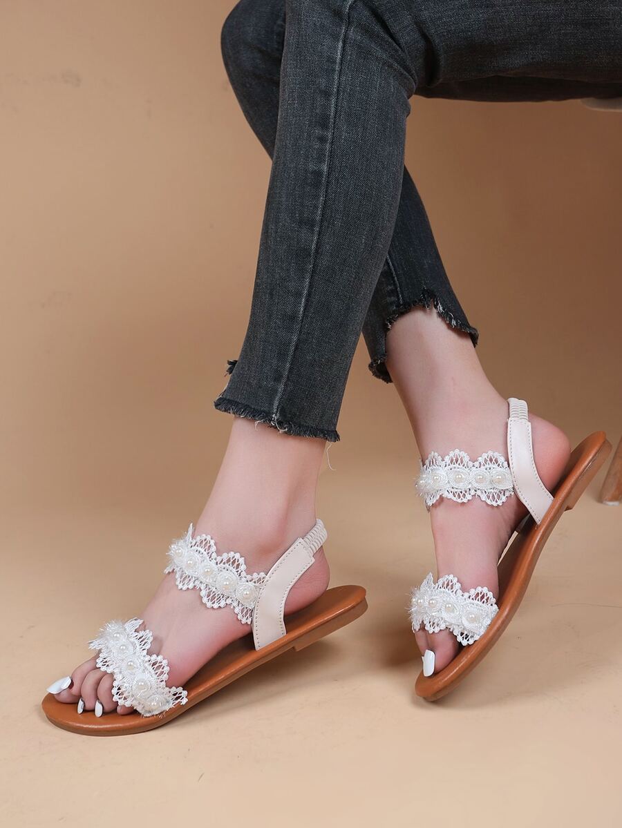 Damen Sandalen mit Kunstperlen Dekor und kontrastierender Spitze, modische Slingback Sandalen aus Stoff für den Sommer