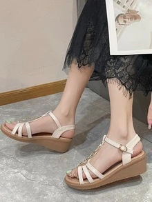 Damen-Knöchelriemensandalen mit Herzdekor, modische beige Keilsandaletten