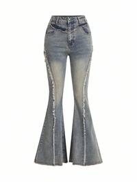 Grunge Punk Y2K Vintage ausgewaschene Farbgürtel Design ausgefranster Saum Dekor Damen Jeans mit Schlag, Stretch, Taillenschnitt