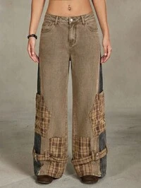 Grunge Punk Ultra tief sitzende, oversized Patchwork Retro Karomuster 2-in-1 Jeans