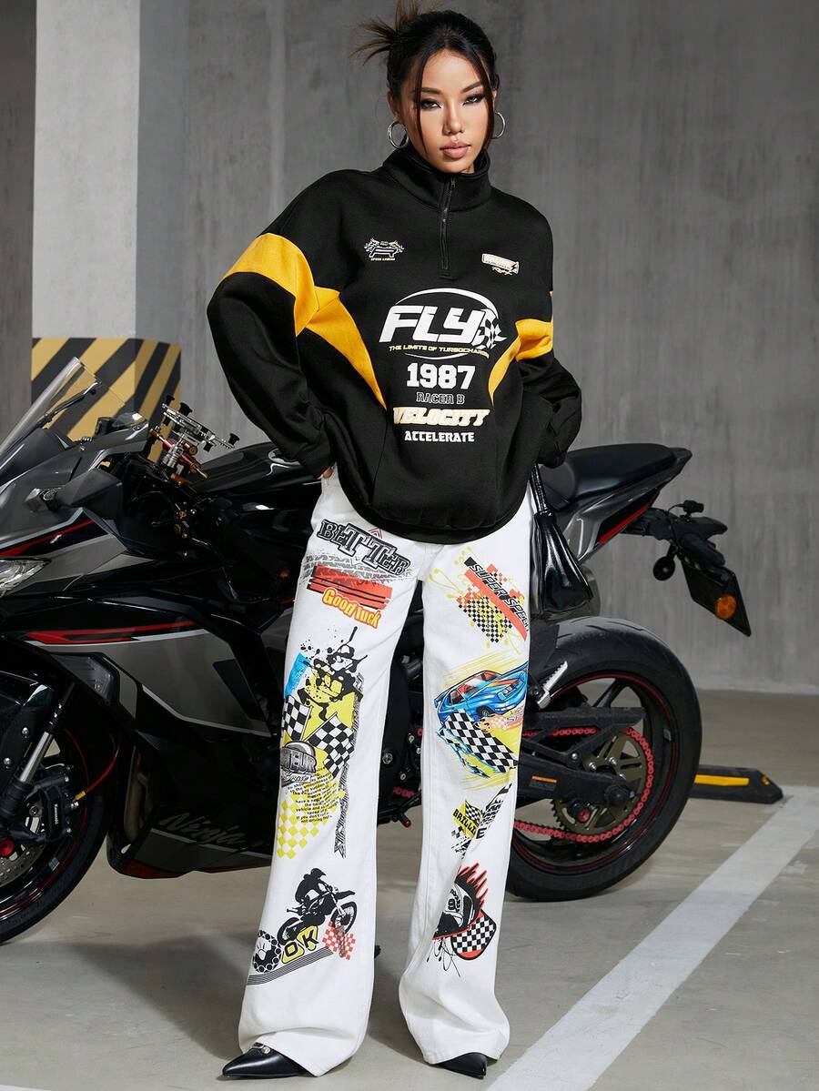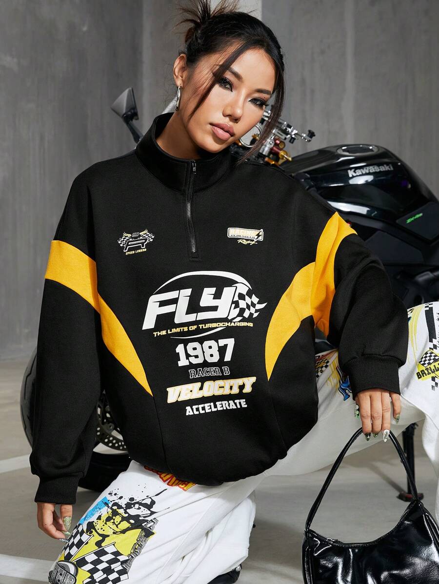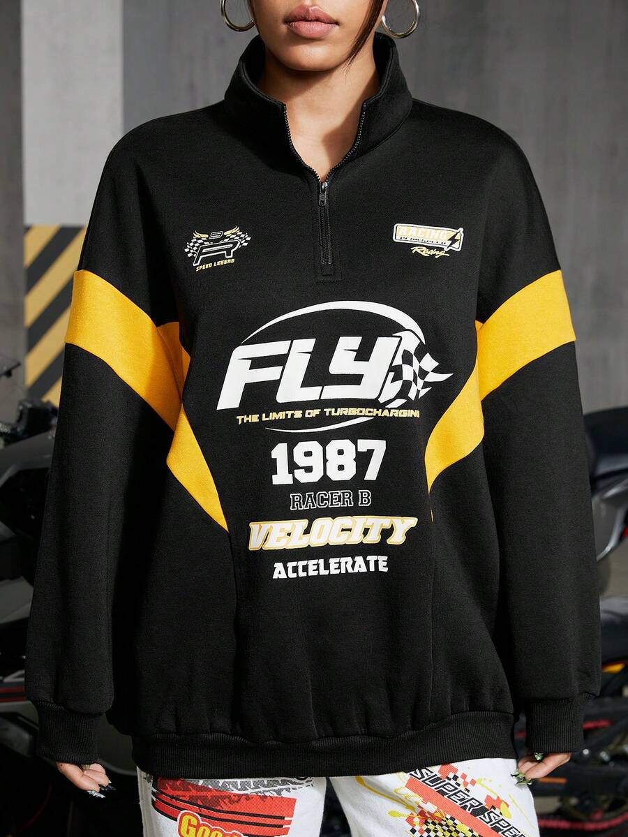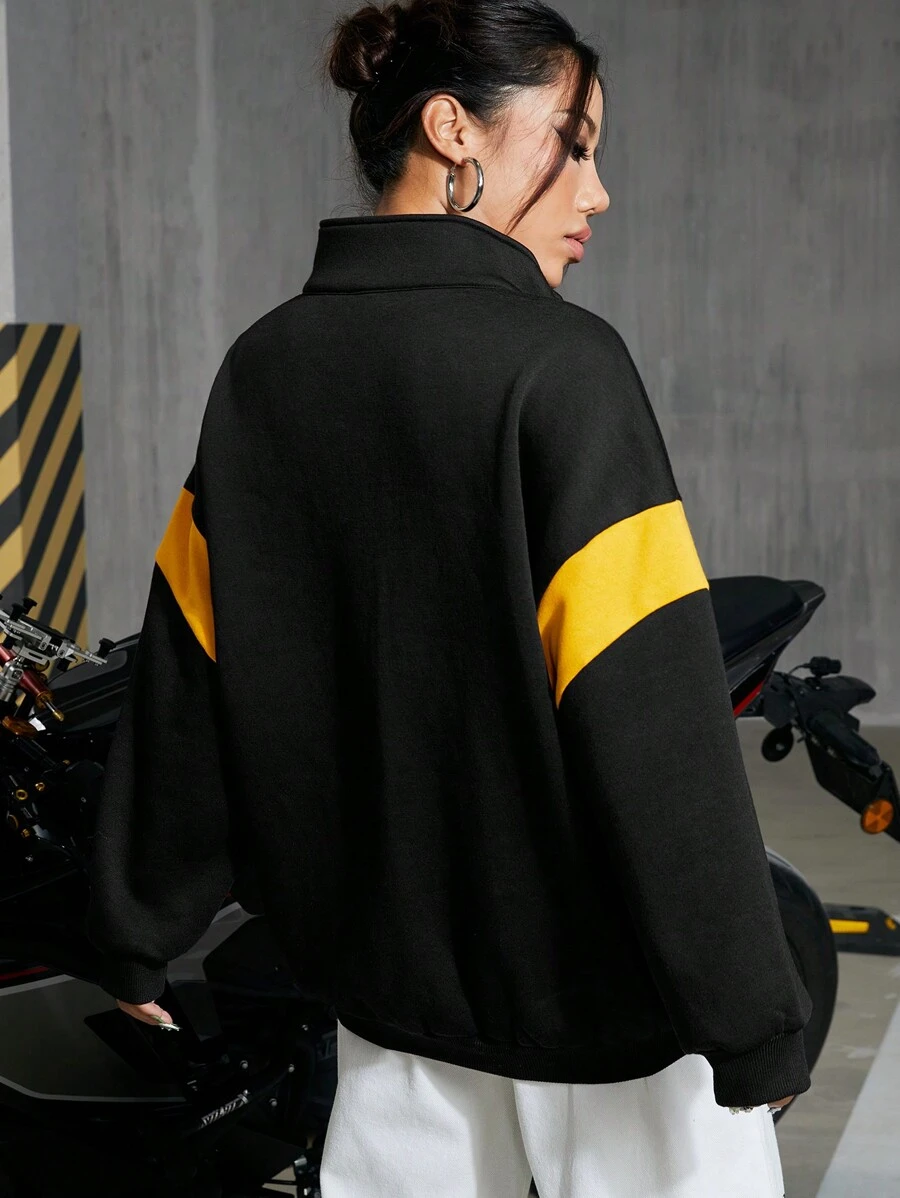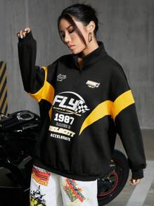Damen Farbblock Buchstabe Bedruckter Reißverschluss Sweatshirt