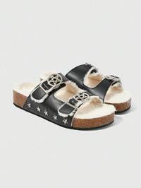 Goth Damen Dunkel Rock Punk Stil geschlossene Zehen Pantoletten mit Stern Schnalle, Hohldekoration, geeignet für Urlaub, Strand, römischer Stil Keil & Plateau Sandalen
