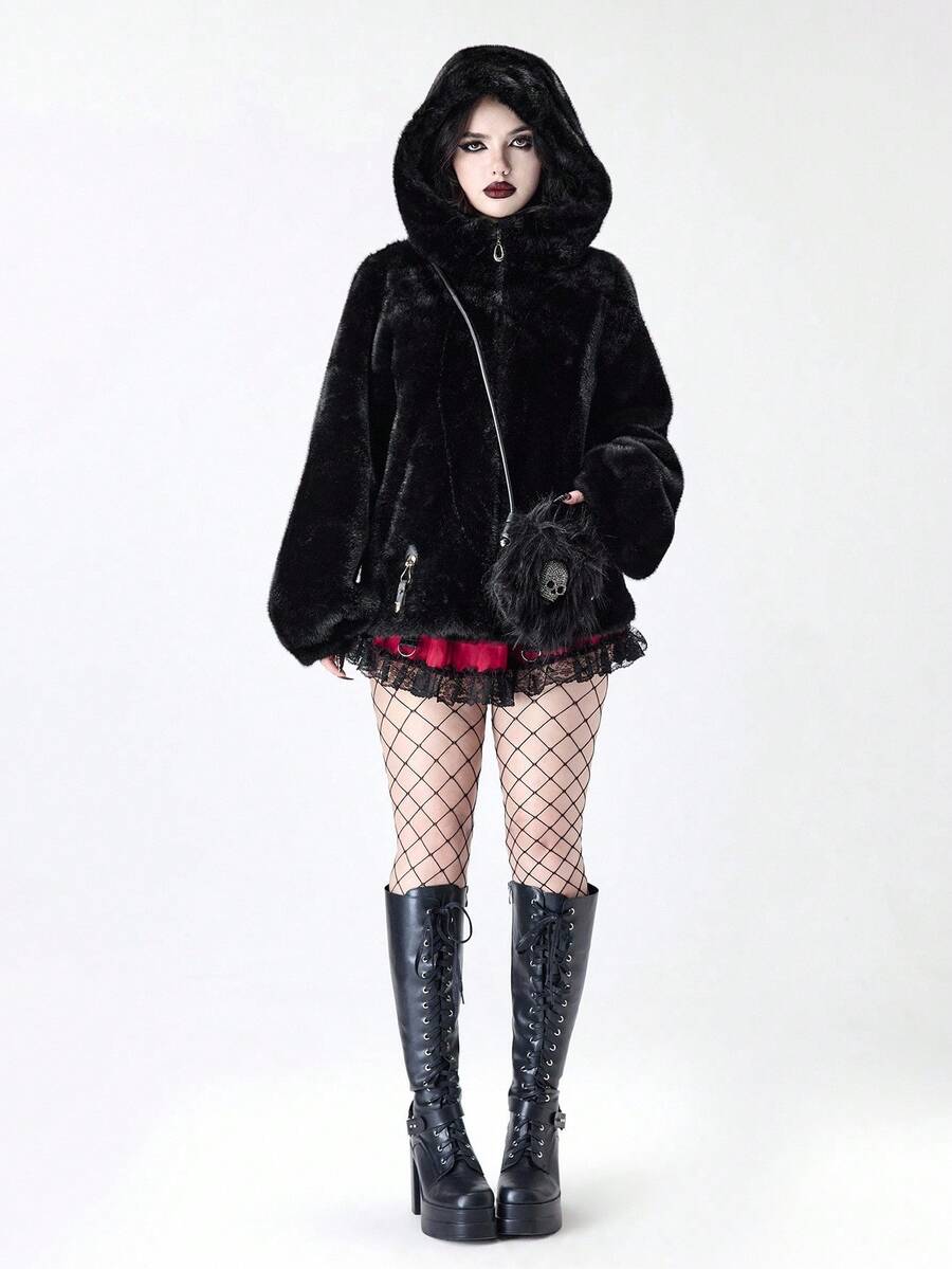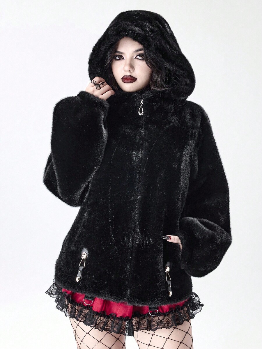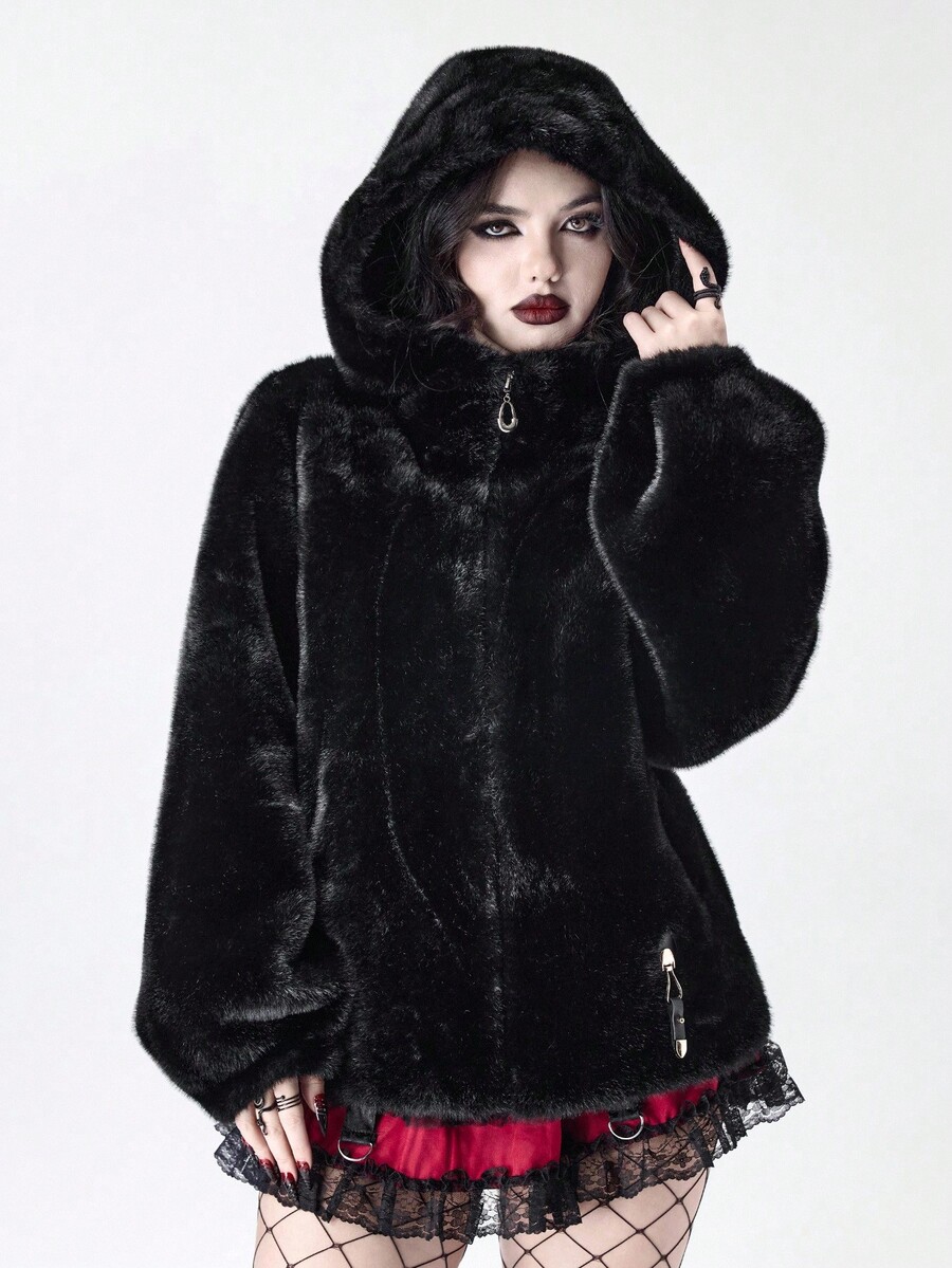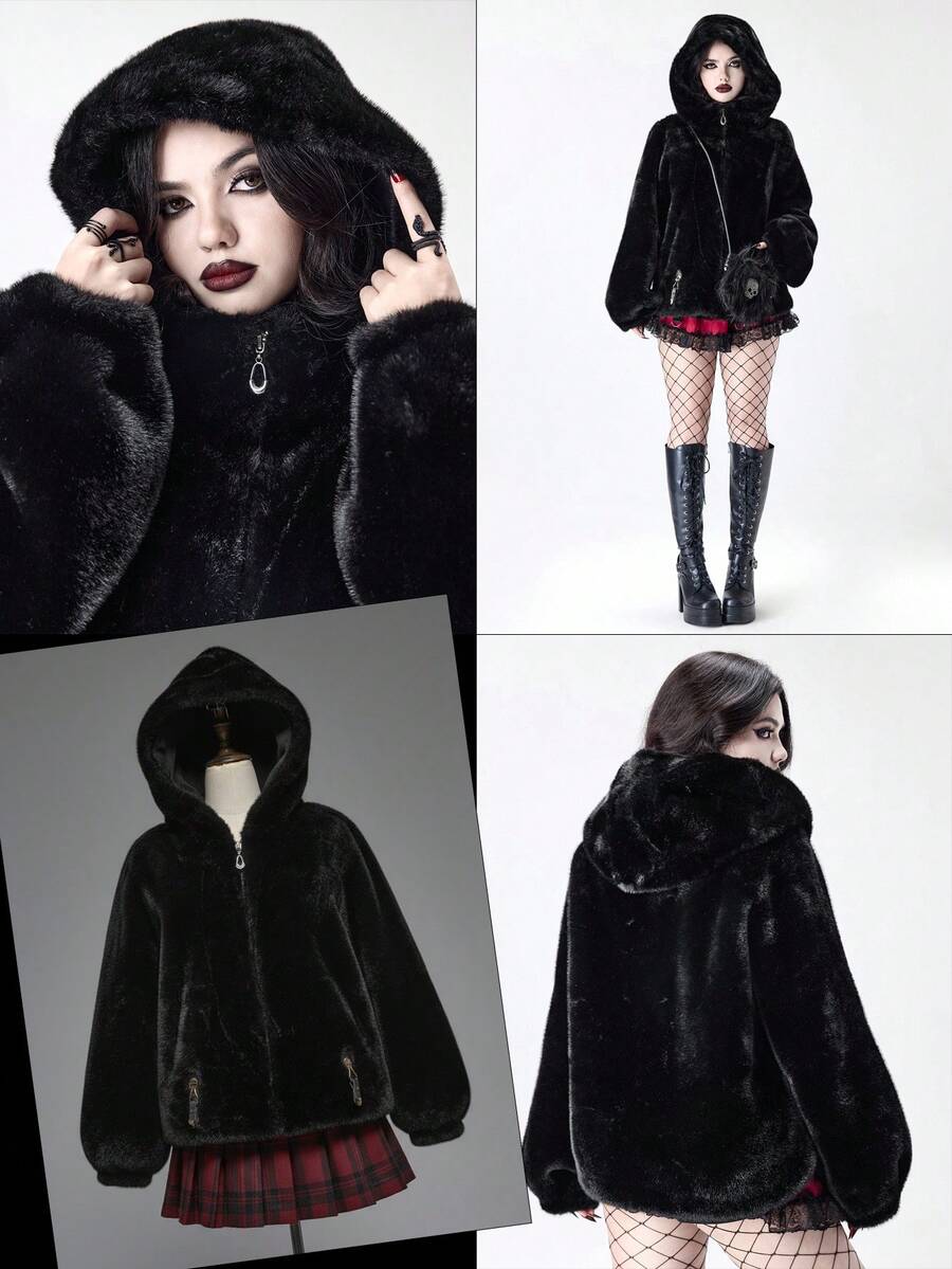 Damen Herbst/Winter Mode Dunkel Punk Stil Reißverschluss Kapuzen Jacke mit Kunstpelz