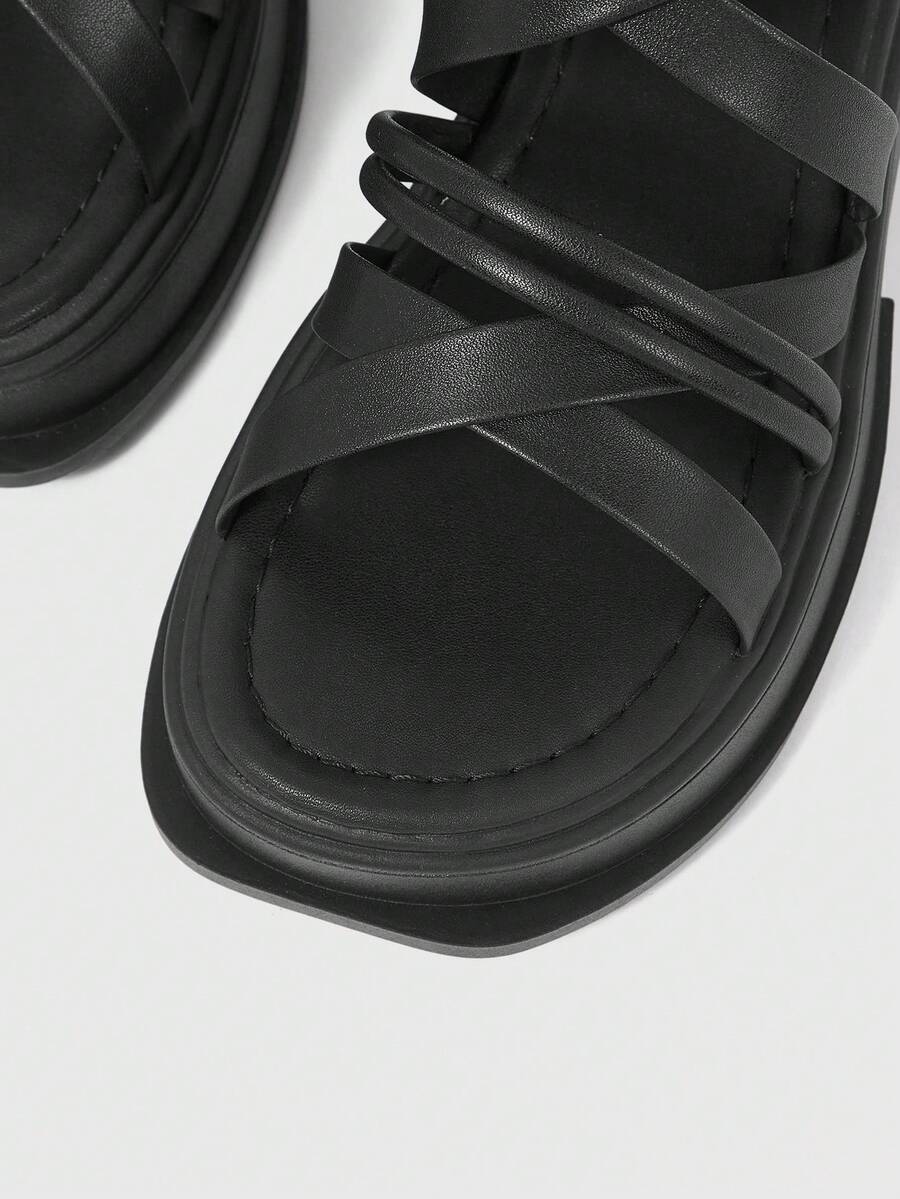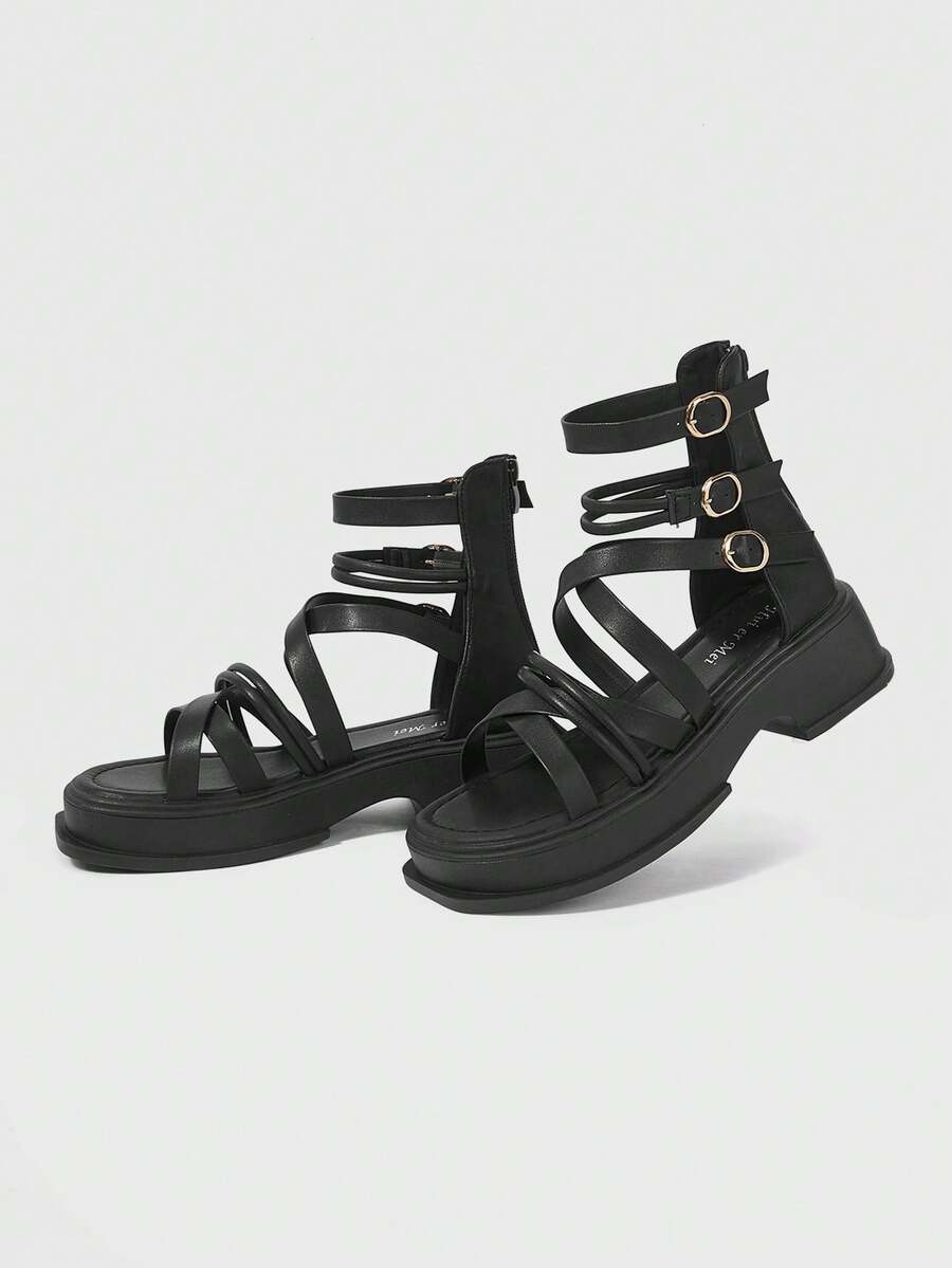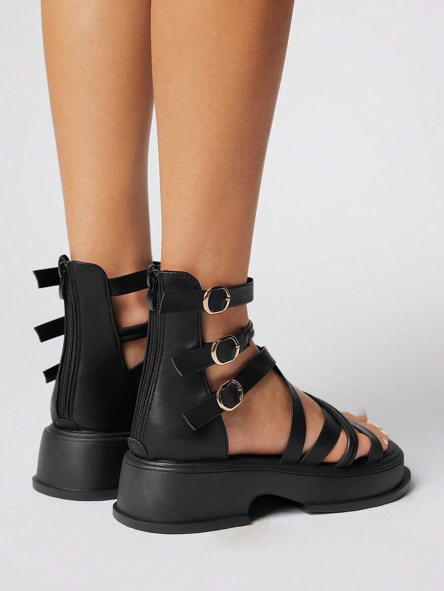 Damen Schwarze Gothic High Heel Sandalen, Sommer Offene Zehen Römische Sandalen mit Reißverschluss, Knöchelriemen Plateau Keilabsatz Sandalen