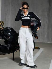 Kurzes Zugeschnittenes T-shirt In Farbblock Für Damen Mit Buchstabe Muster