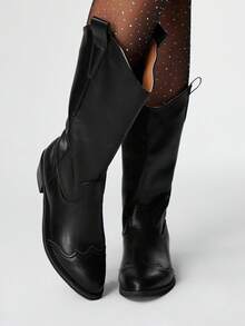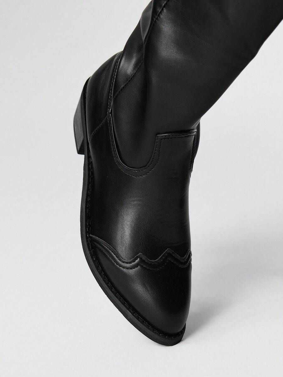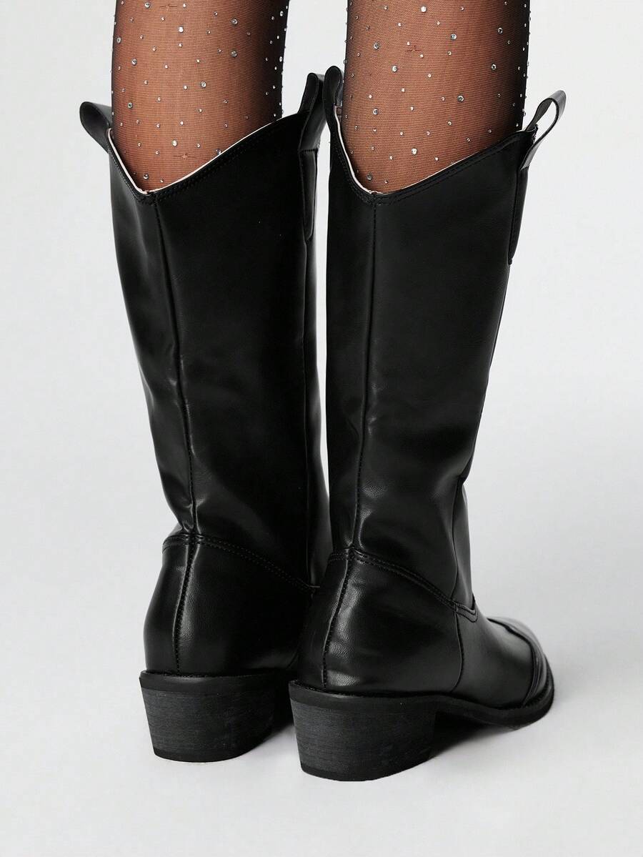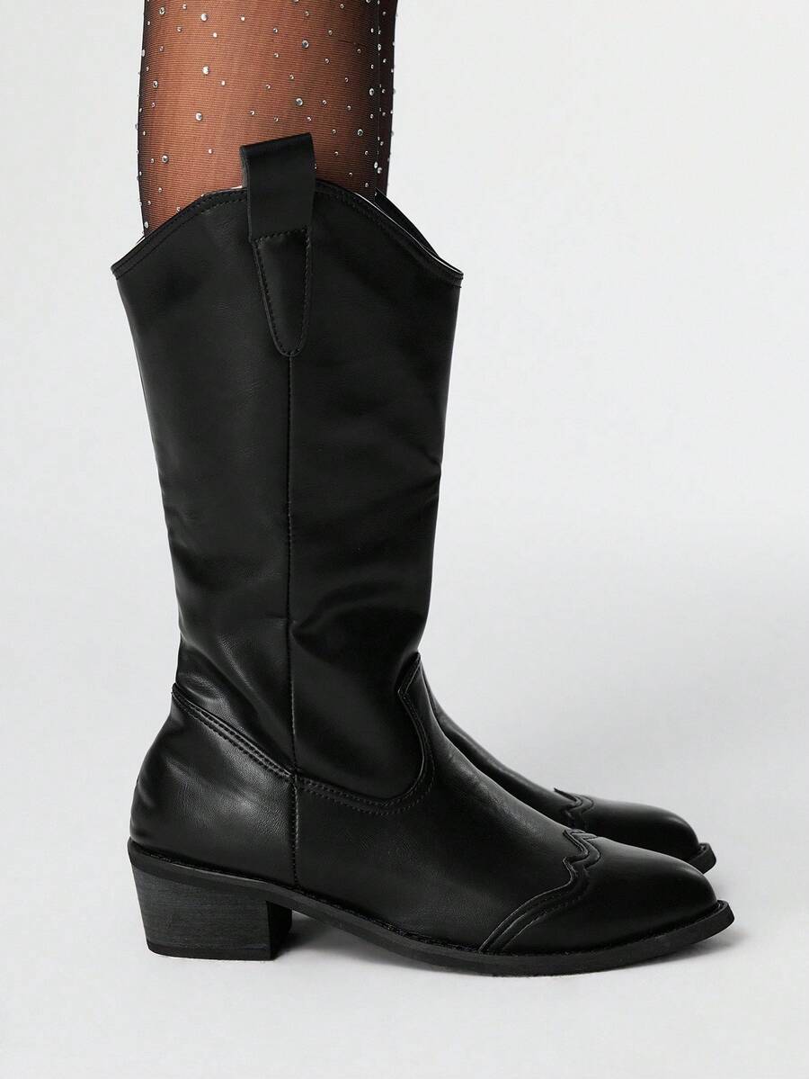 Damen Dunkel Punk Gothic Stiefel, schwarze bestickte Western Langstiefel mit niedrigen Absätzen, Leder Knöchel- und Kurzstiefel
