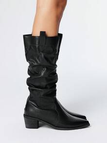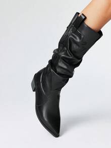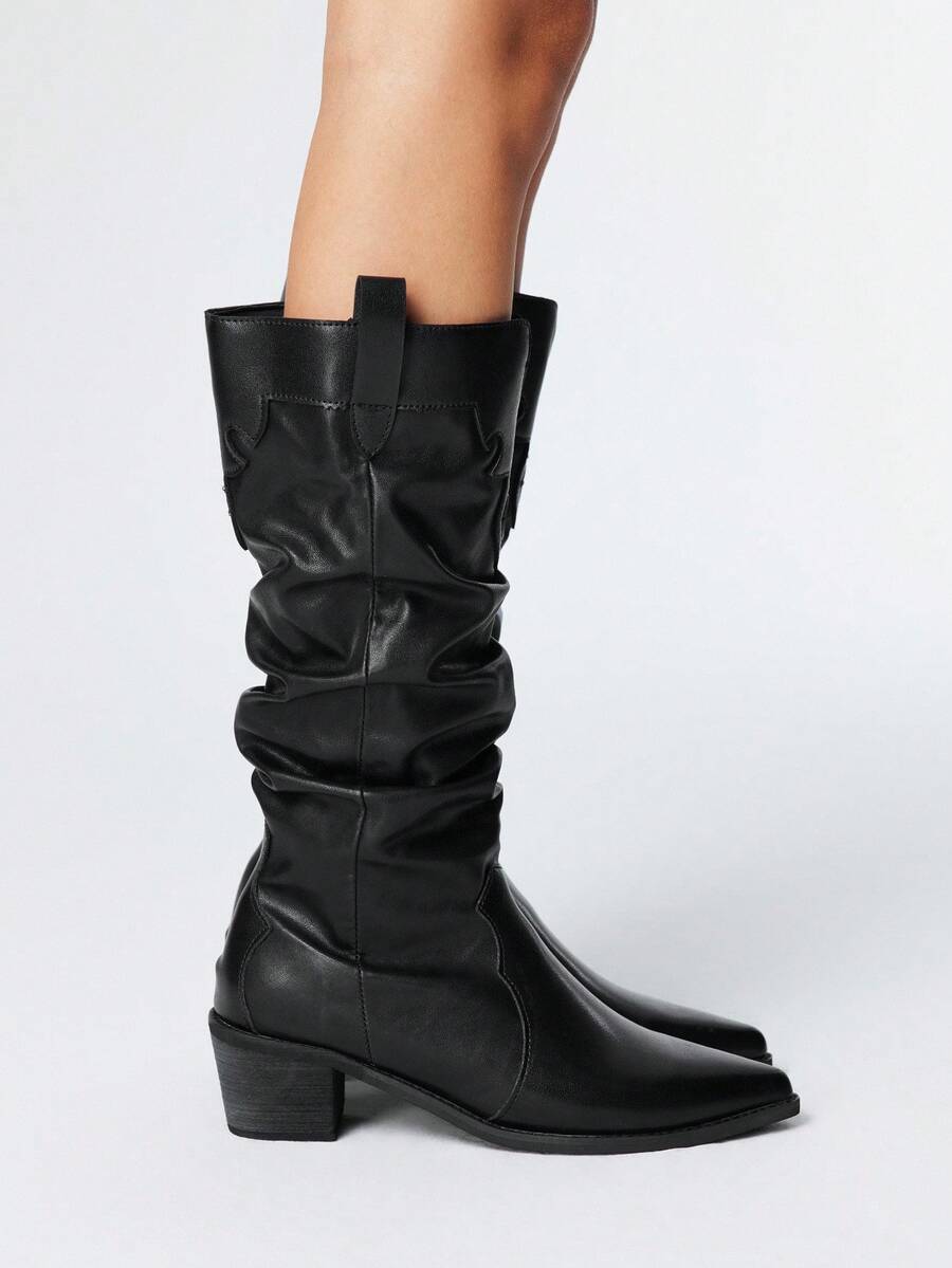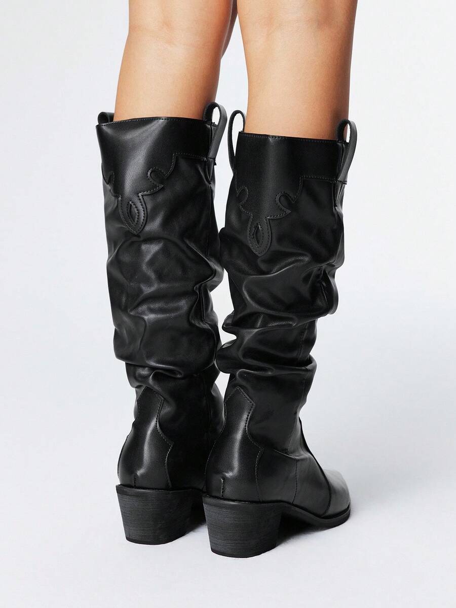 Damen Dunkel Rock Punk Goth Stiefel, schwarze Stickerei Western Langschaftstiefel, Leder Mittelhoch Stiefel mit niedrigem Absatz