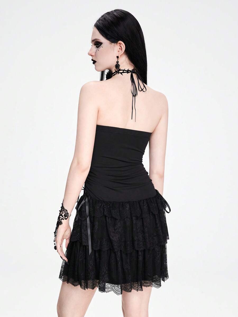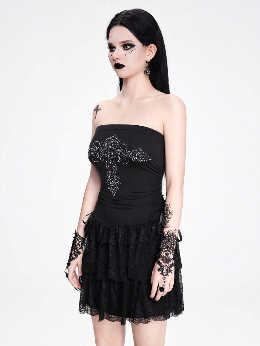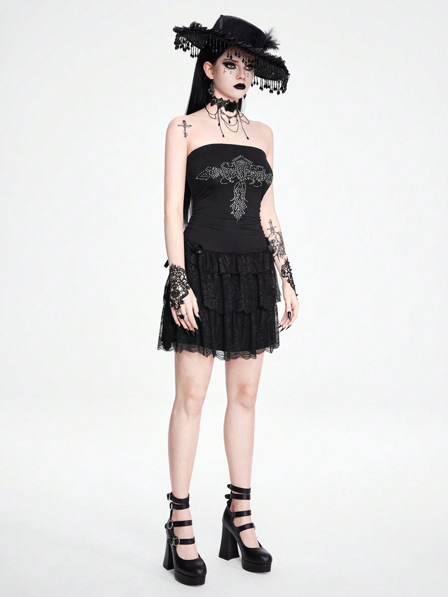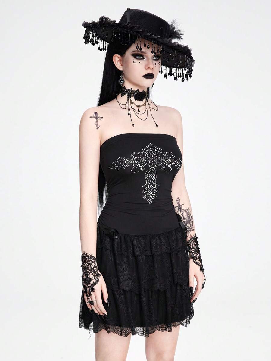 Goth Gotischer, Rüschen Spitzen Saum Kleid mit Strass Kreuz und gerafftem trägerlosem Top für Damen, Sommer