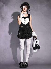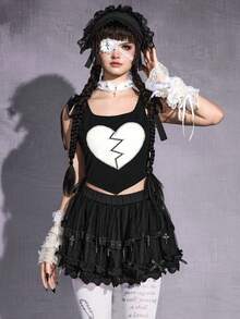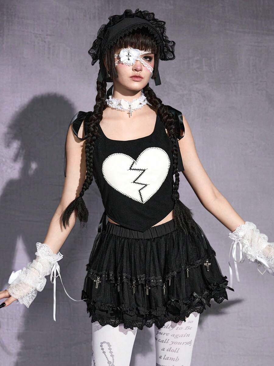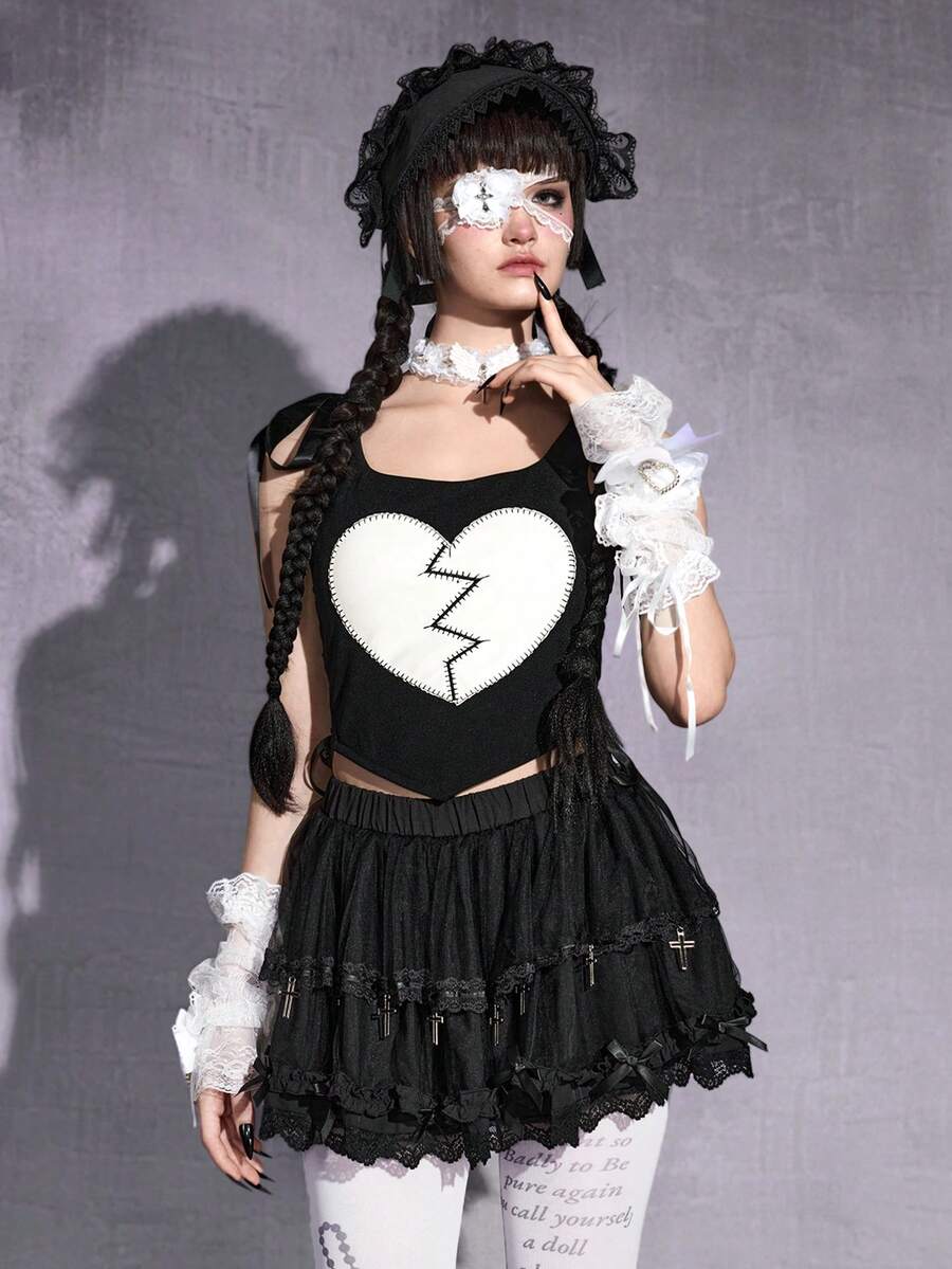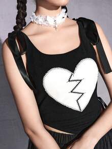 Damen Gothic Herz Stickerei Schleife Schulter Slim Crop Camisole