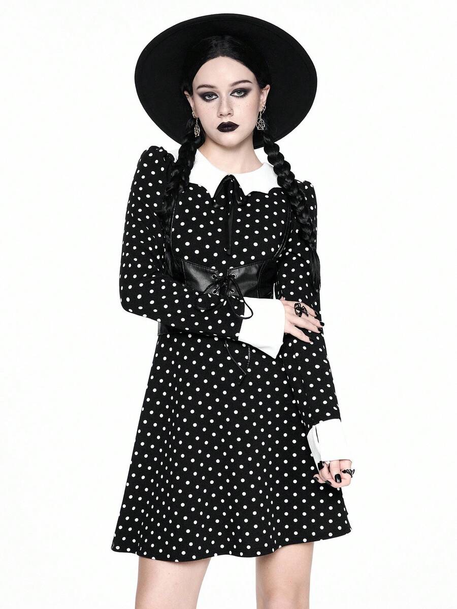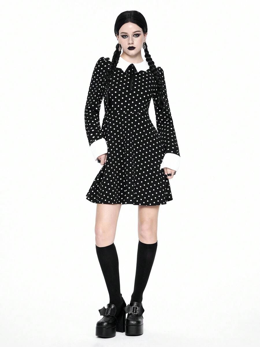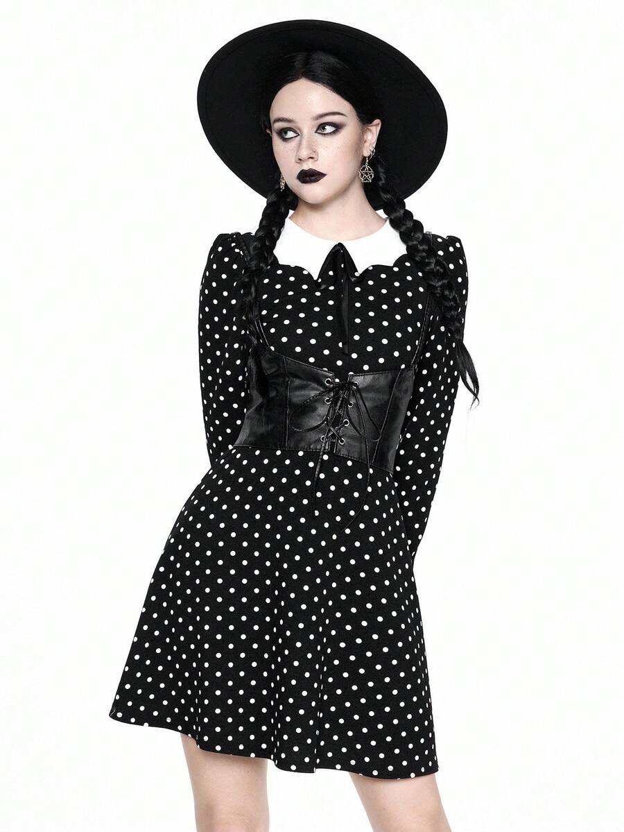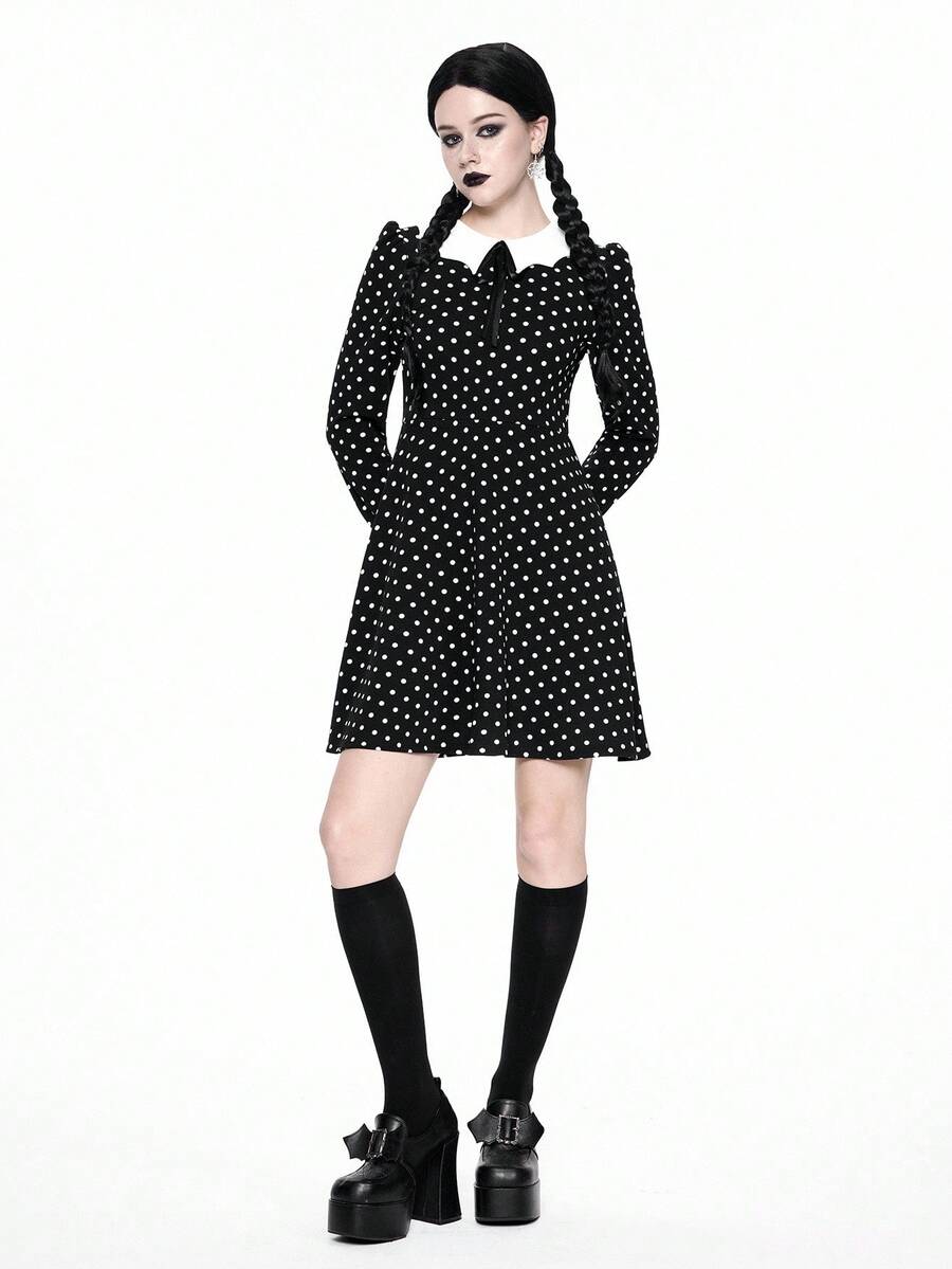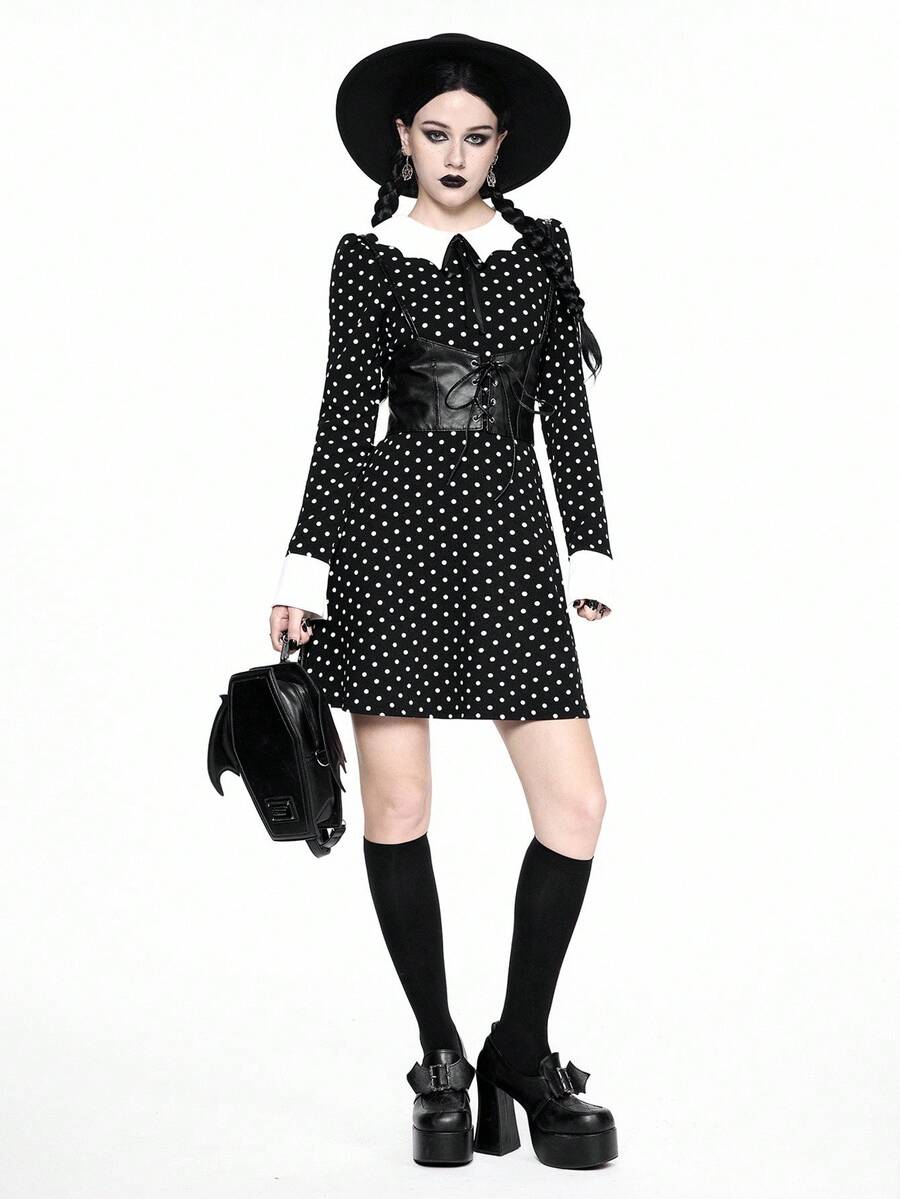 Damen Gothic Kleid mit Polka Dot Muster und Fledermaus Kragen, Halloween